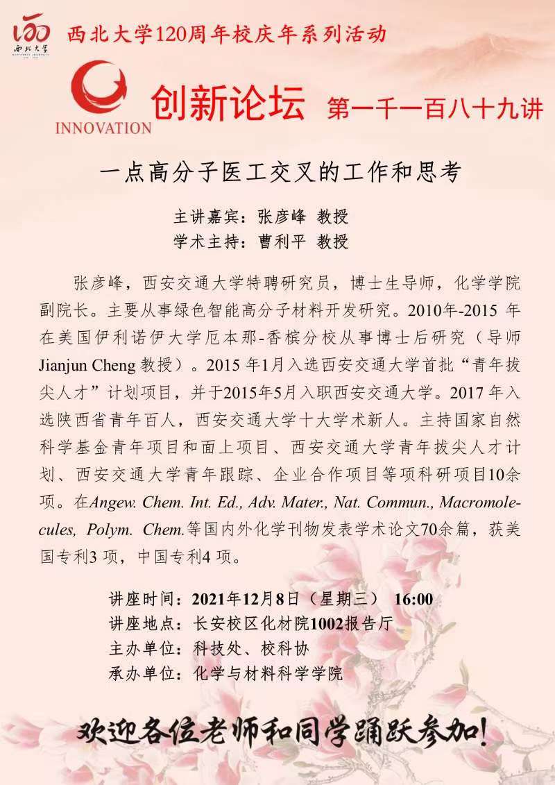 张彦峰 教授 九游会在线登录官网创新论坛第一千一百八十九讲暨120周年校庆年系列活动:一点高分子医工交叉的工作和思考 讲座时间 2021年12月8日(星期三) 16:00 讲座地点 长安校区化材院1002报告厅 讲座人介绍 张彦峰 教授 讲座内容