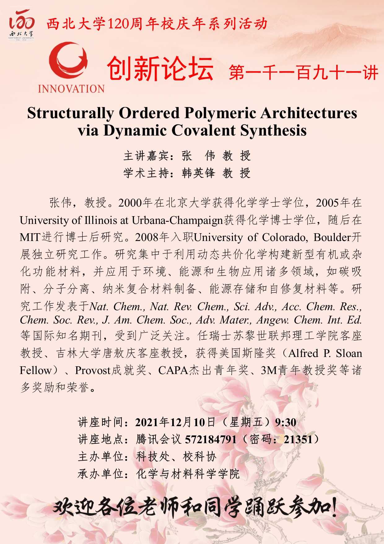 张伟 教授 九游会在线登录官网创新论坛第一千一百九十一讲暨120周年校庆年系列活动:Structurally Ordered Polymeric Architectures via Dynamic Covalent Synthesis 讲座时间 2021年12月10日(星期五)9:30 讲座地点 腾讯会议 572184791(密码:21351) 讲座人介绍 张伟 教授 讲座内容