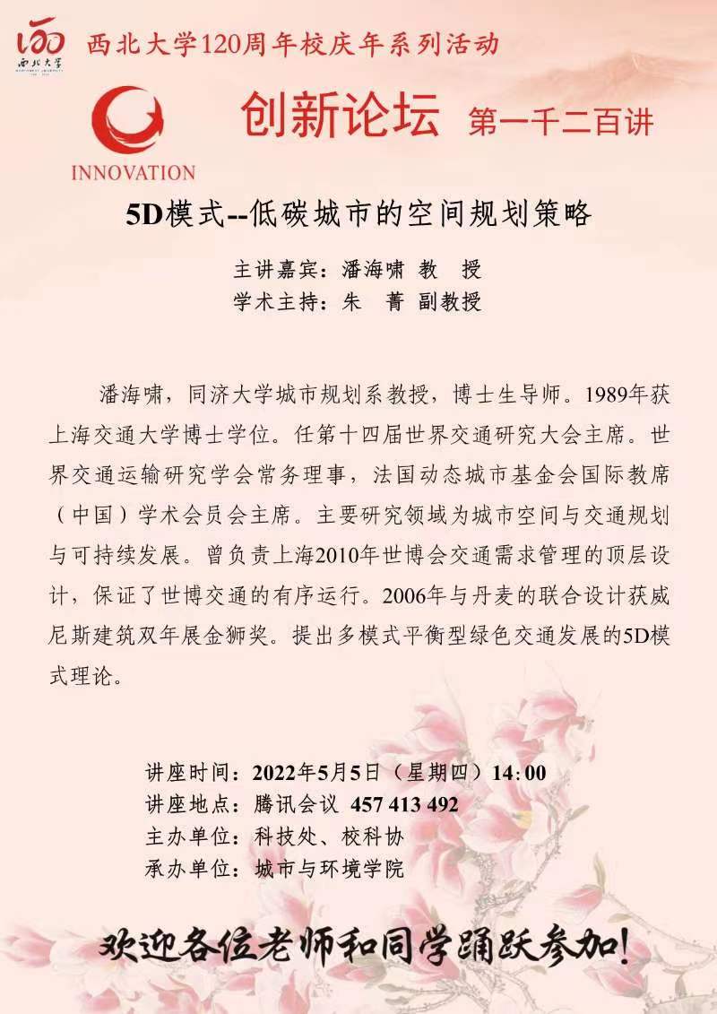 潘海啸 教授 九游会在线登录官网创新论坛第一千二百讲暨120周年校庆年系列活动:5D模式--低碳城市的空间规划策略 讲座时间 2022年5月5日(星期四)14:00 讲座地点 腾讯会议:457 413 492 讲座人介绍 潘海啸 教授 讲座内容