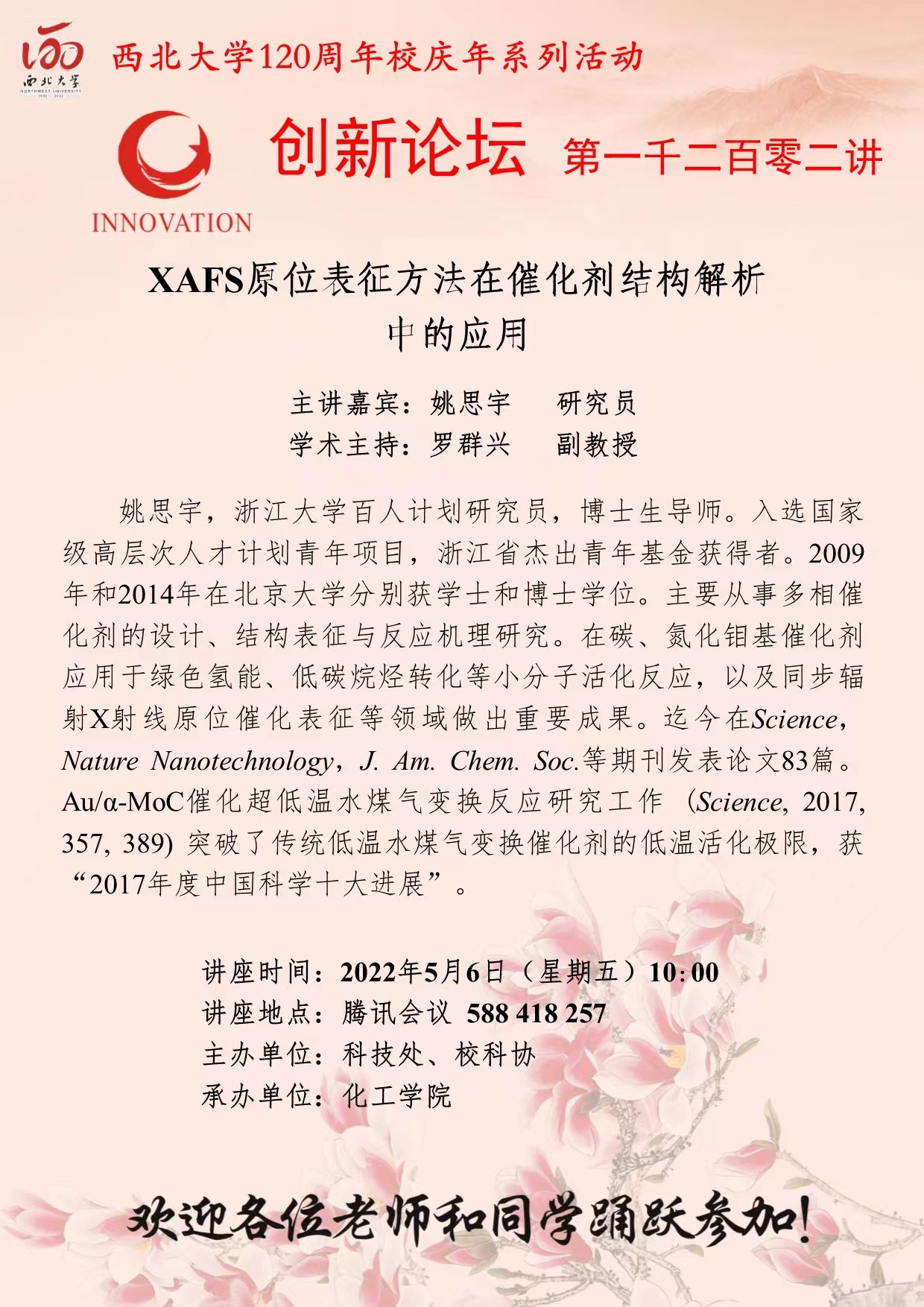 姚思宇 研究员 九游会在线登录官网创新论坛第一千二百零二讲暨120周年校庆年系列活动:XAFS原位表征方法在催化剂结构解析中的应用 讲座时间 2022年5月6日(星期五)10:00 讲座地点 腾讯会议:588 418 257 讲座人介绍 姚思宇 研究员 讲座内容
