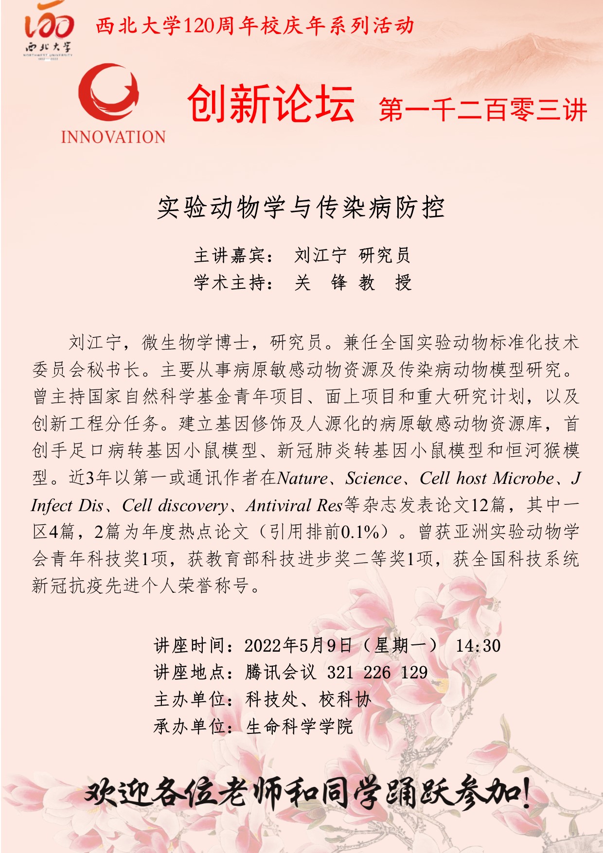 刘江宁 研究员 九游会在线登录官网创新论坛第一千二百零三讲暨120周年校庆年系列活动:实验动物学与传染病防控 讲座时间 2022年5月9日(星期一) 14:30 讲座地点 腾讯会议 321 226 129 讲座人介绍 刘江宁 研究员 讲座内容