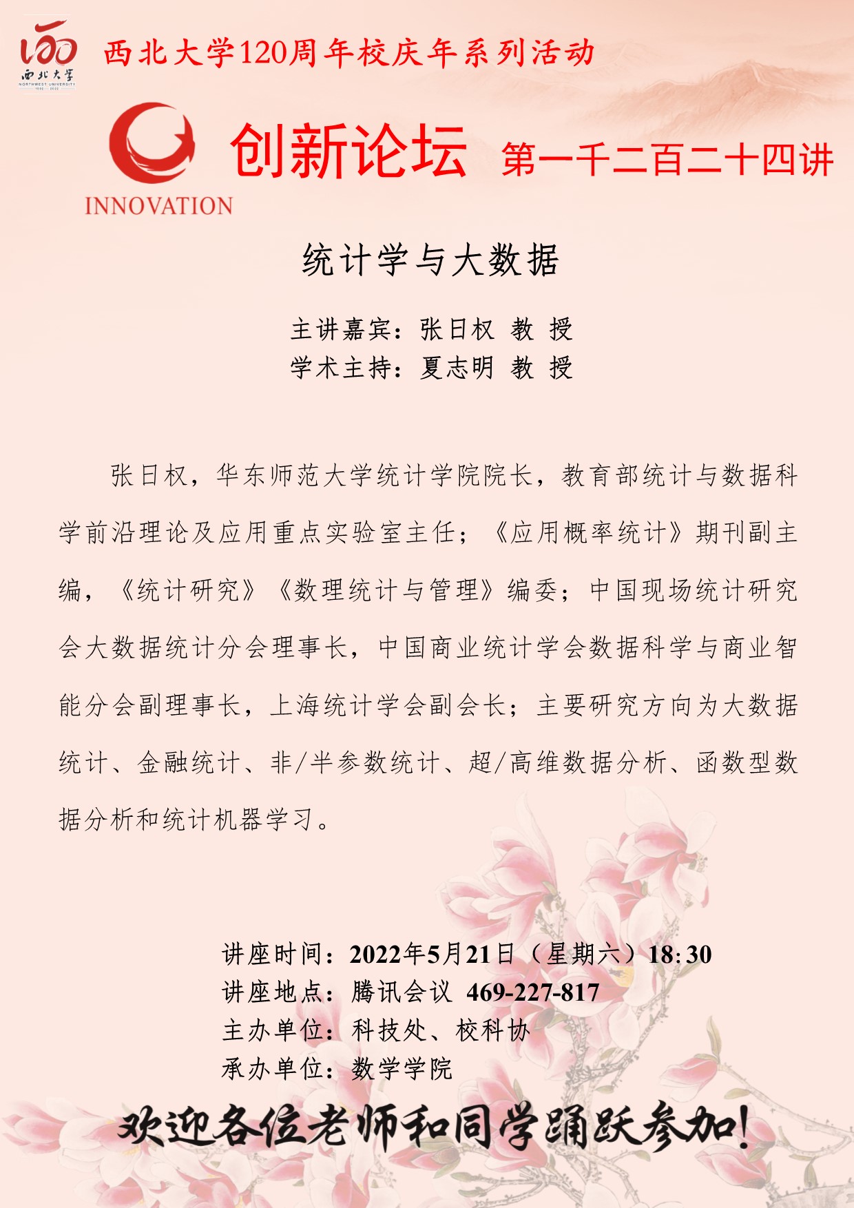 张日权 教授 九游会在线登录官网创新论坛第一千二百二十四讲暨120周年校庆年系列活动:统计学与大数据 讲座时间 2022年5月21日(星期六)18:30 讲座地点 腾讯会议 469-227-817 讲座人介绍 张日权 教授 讲座内容