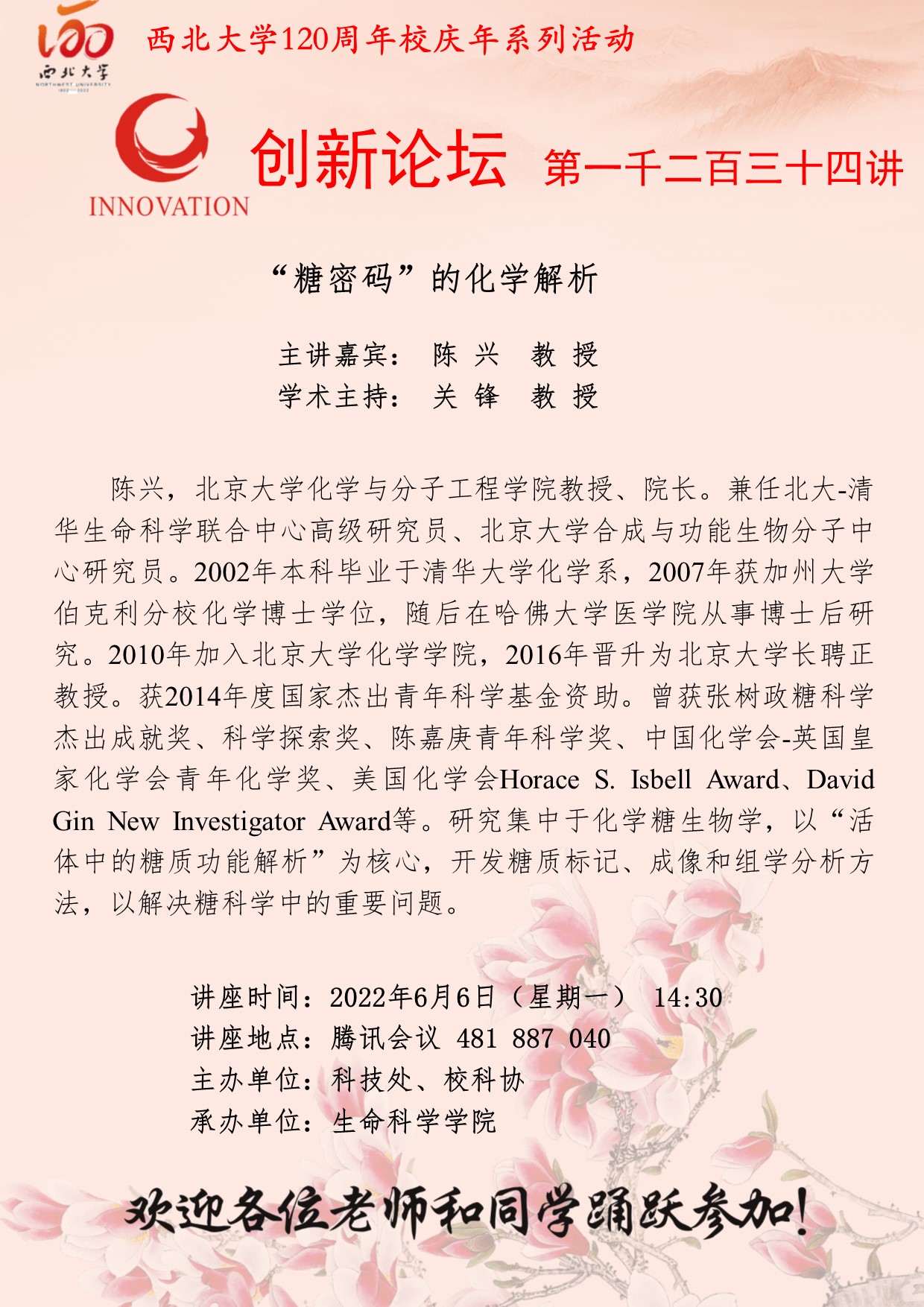 陈兴 教授 九游会在线登录官网创新论坛第一千二百三十四讲暨120周年校庆年系列活动:“糖密码”的化学解析 讲座时间 2022年6月6日(星期一) 14:30 讲座地点 腾讯会议 481 887 040 讲座人介绍 陈兴 教授 讲座内容