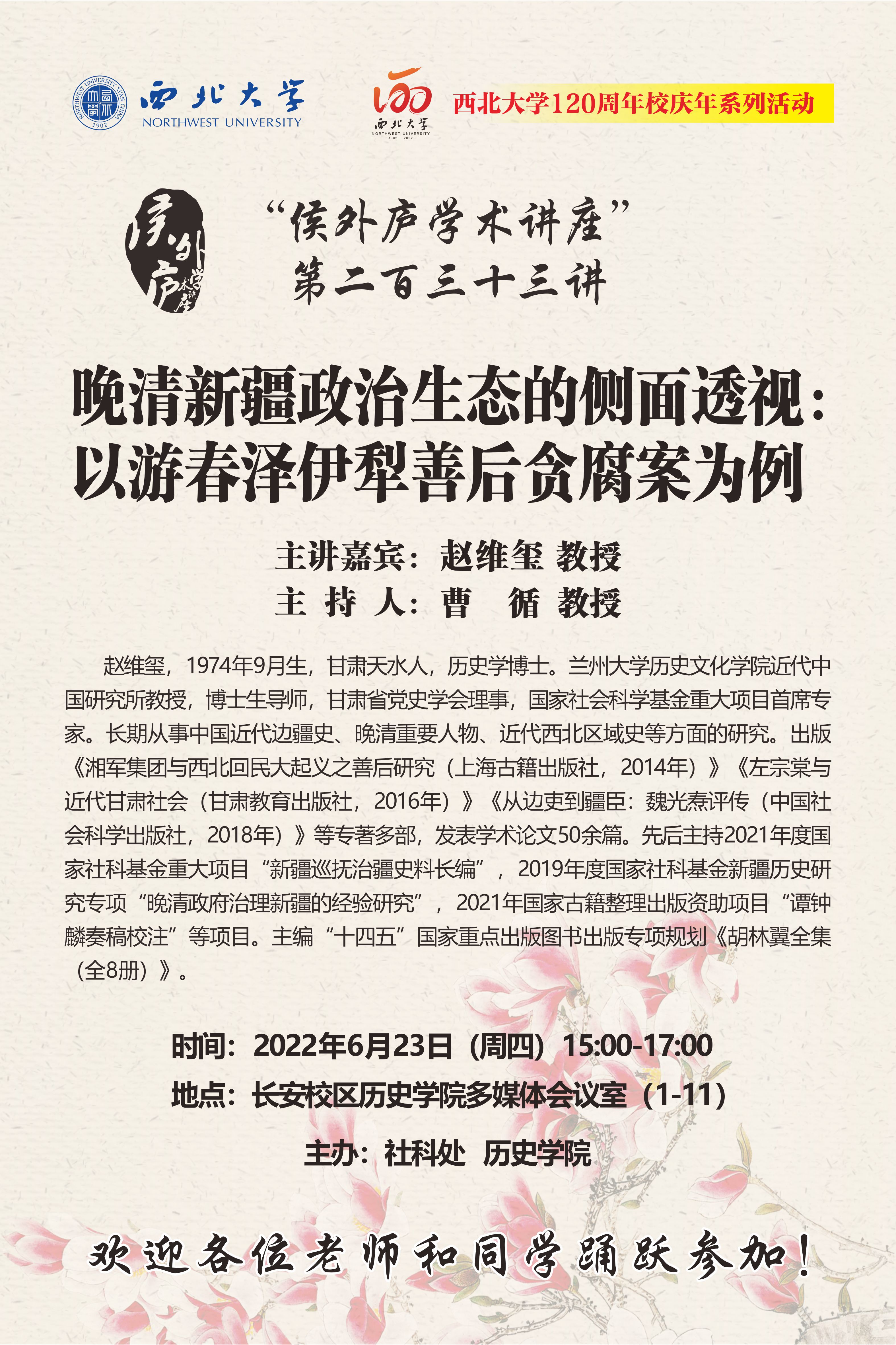 侯外庐学术讲座第二百三十三讲暨120周年校庆年系列活动:晚清新疆政治生态的侧面透视:以游春泽伊犁善后贪腐案为例