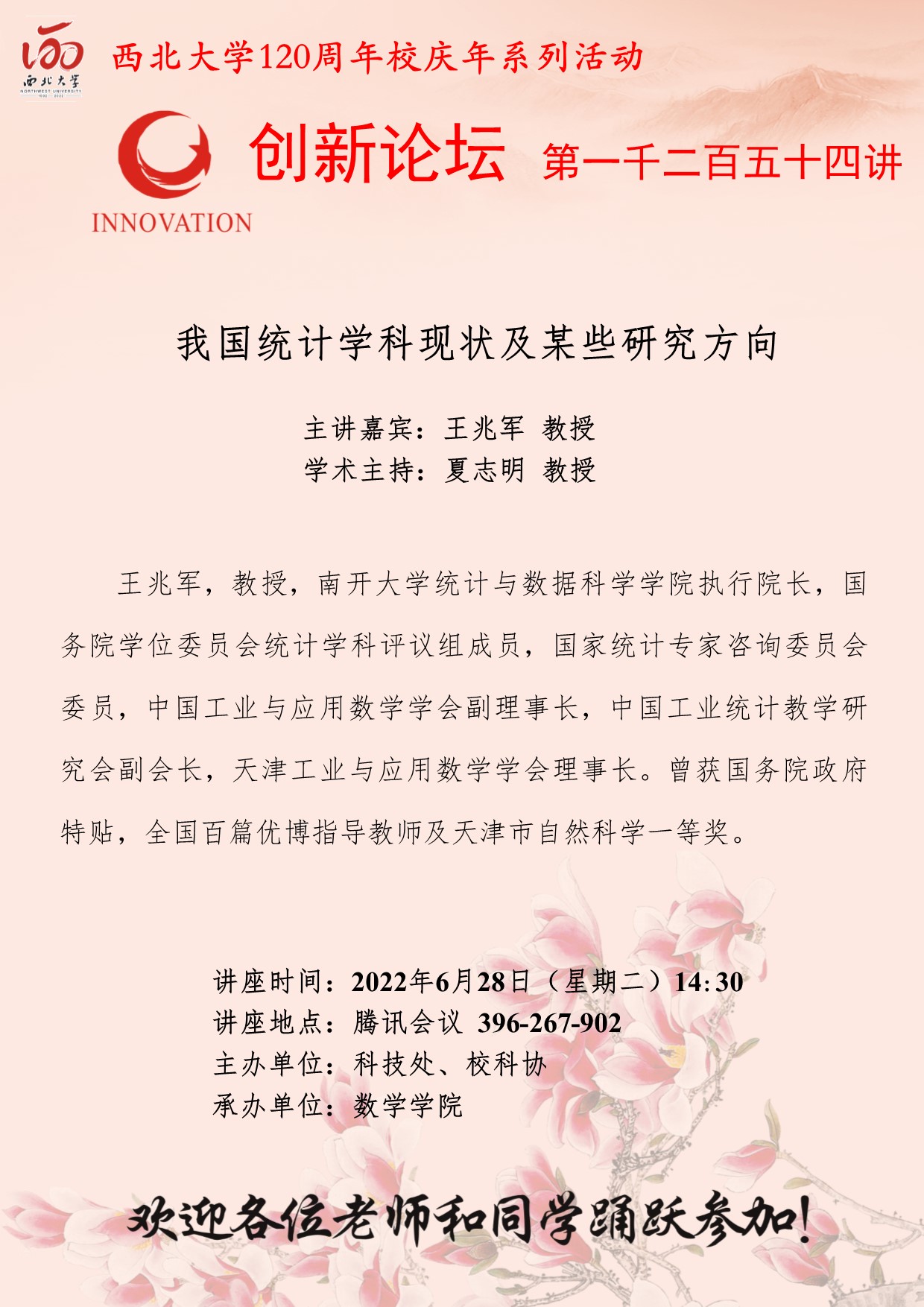 王兆军 教授 九游会在线登录官网创新论坛第一千二百五十四讲暨120周年校庆年系列活动:我国统计学科现状及某些研究方向 讲座时间 2022年6月28日(星期二)14:30 讲座地点 腾讯会议 396-267-902 讲座人介绍 王兆军 教授 讲座内容