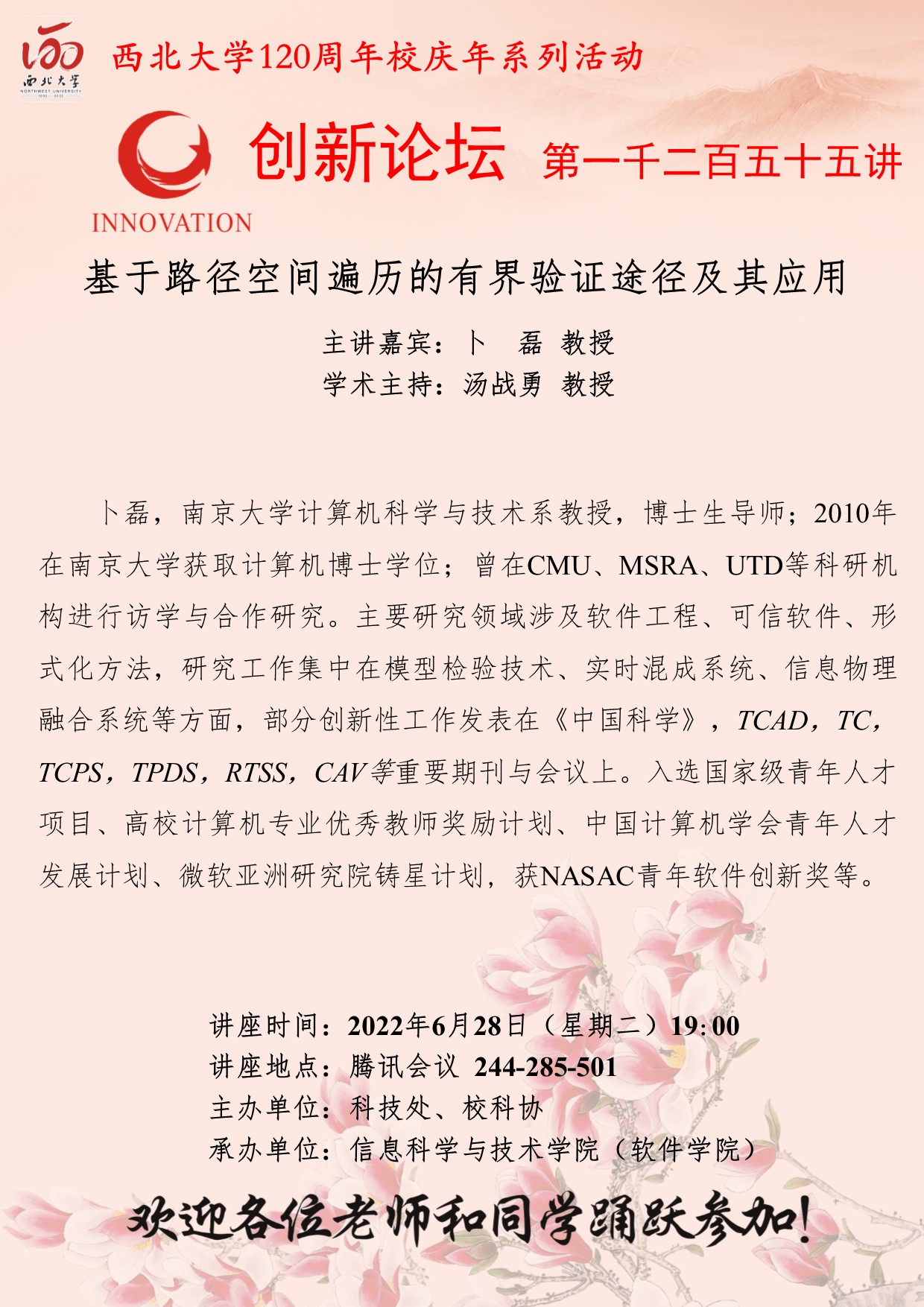 卜磊 教授 九游会在线登录官网创新论坛第一千二百五十五讲暨120周年校庆年系列活动:基于路径空间遍历的有界验证途径及其应用 讲座时间 2022年6月28日(星期二)19:00 讲座地点 腾讯会议 244-285-501 讲座人介绍 卜磊 教授 讲座内容