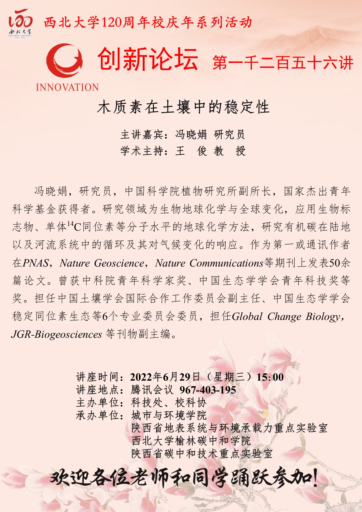 冯晓娟 研究员 九游会在线登录官网创新论坛第一千二百五十六讲暨120周年校庆年系列活动:木质素在土壤中的稳定性 讲座时间 2022年6月29日(星期三)15:00 讲座地点 腾讯会议 967-403-195 讲座人介绍 冯晓娟 研究员 讲座内容