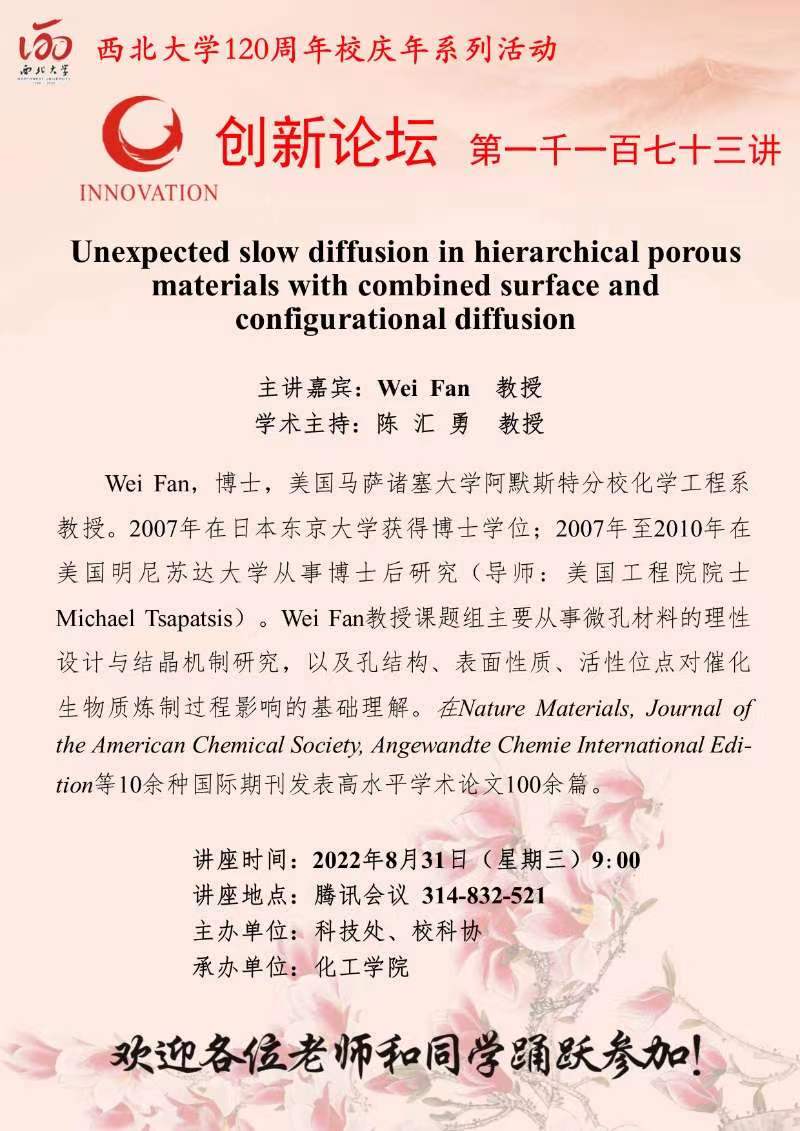 Wei Fan 教授 九游会在线登录官网创新论坛第一千二百七十三讲暨120周年校庆年系列活动: Unexpected slow diffusion in hierarchical porous materials with combined surface and configurational diffusion 讲座时间 2022年8月31日(星期三)9:00 讲座地点 腾讯会议 314-832-521 讲座人介绍 Wei Fan 教授 讲座内容