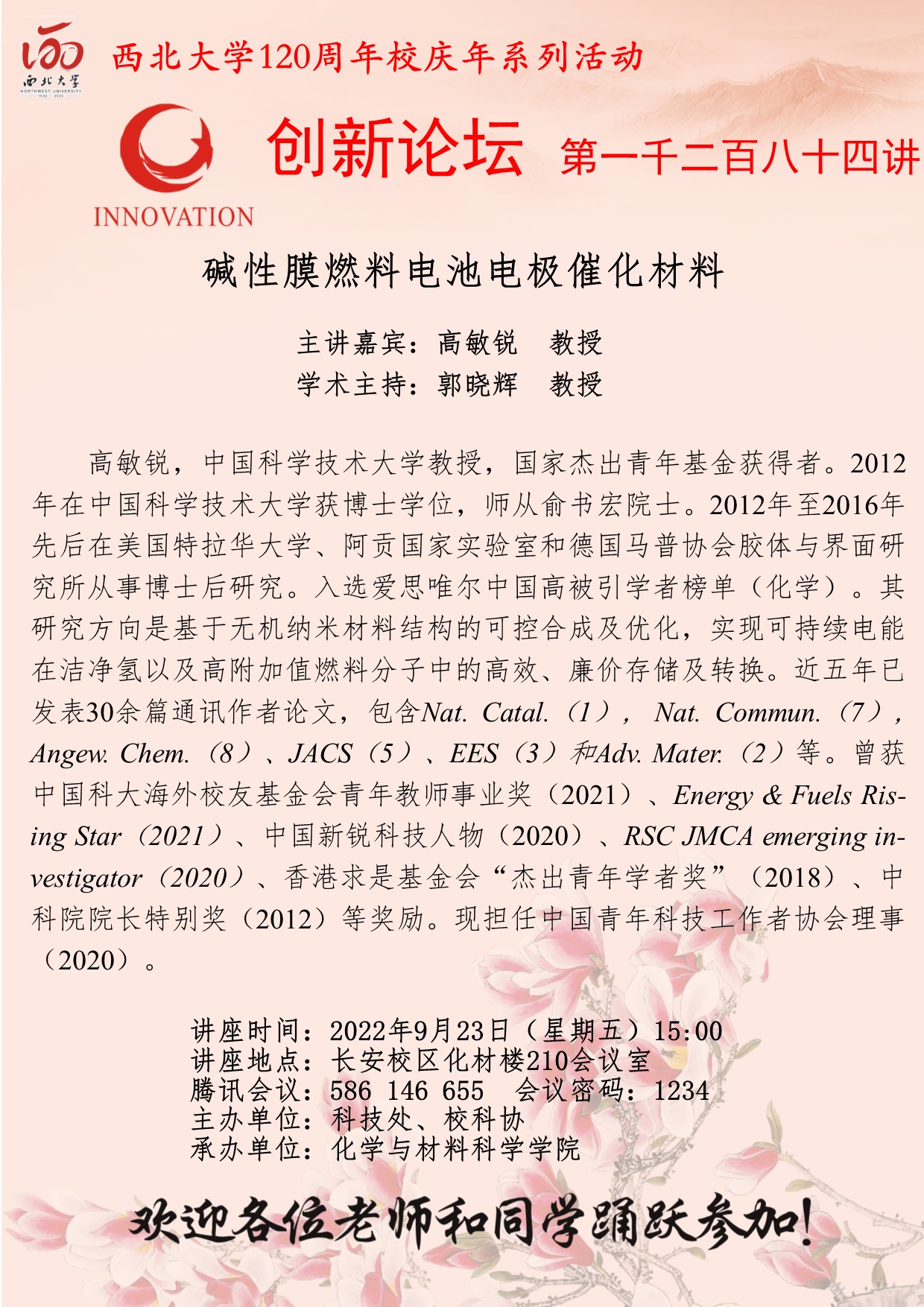 高敏锐 教授 九游会在线登录官网创新论坛第一千二百八十四讲暨120周年校庆年系列活动:碱性膜燃料电池电极催化材料 讲座时间 2022年9月21日(星期五) 15:00 讲座地点 长安校区化材楼210会议室 (腾讯会议:586 146 655 会议密码:1234) 讲座人介绍 高敏锐 教授 讲座内容