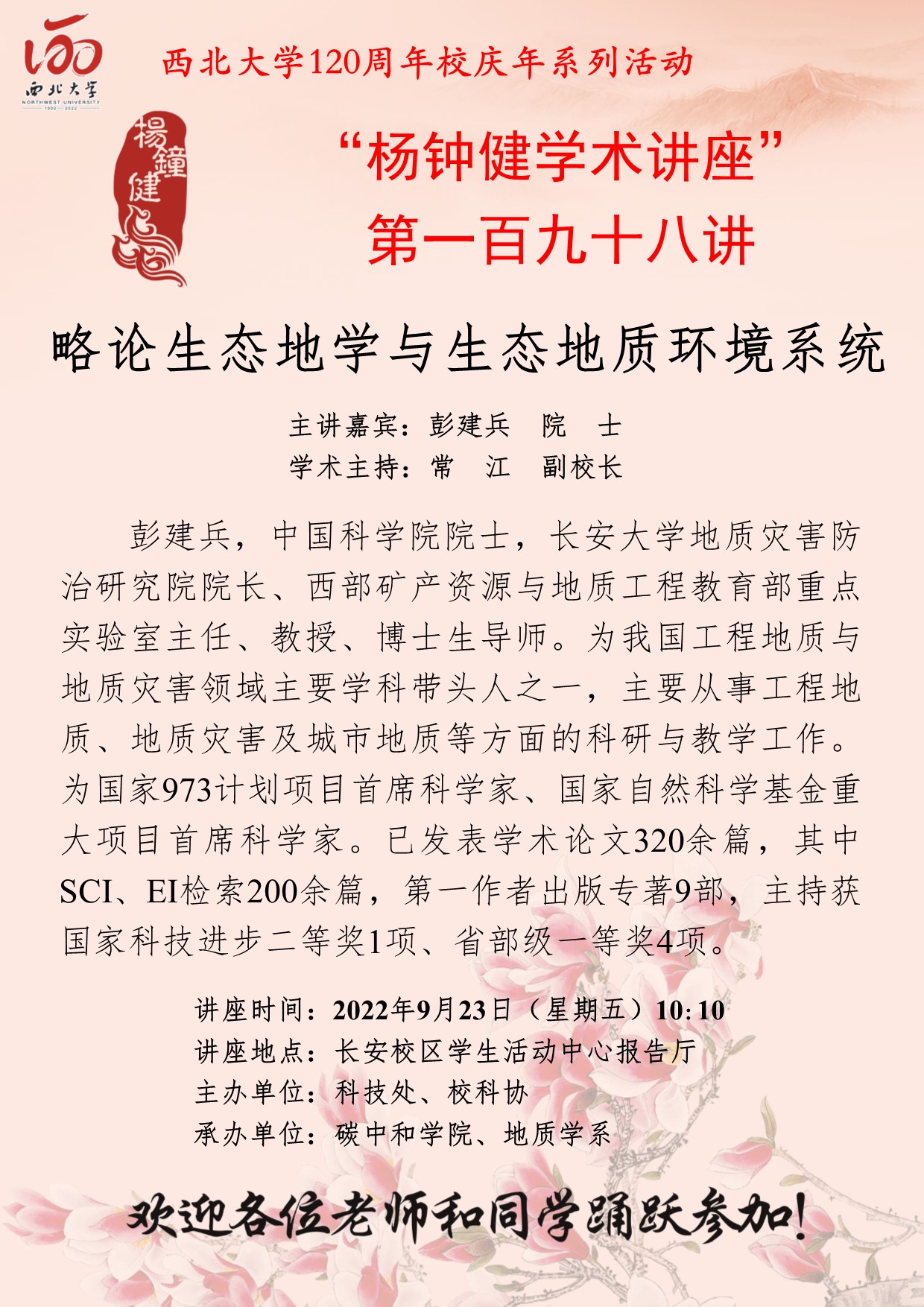 “杨钟健学术讲座”第一百九十八讲暨120周年校庆年系列活动:略论生态地学与生态地质环境系统