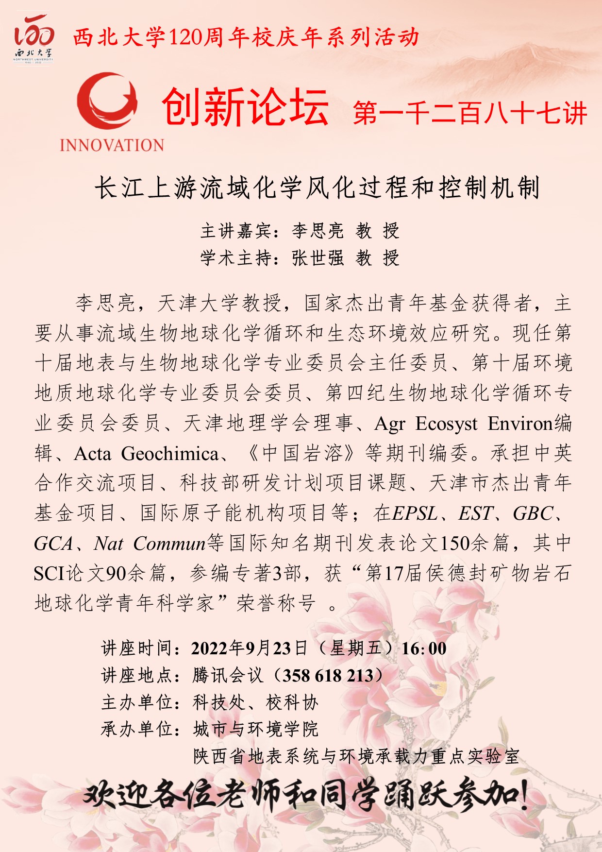 李思亮 教授 九游会在线登录官网创新论坛第一千二百八十七讲暨120周年校庆年系列活动: 长江上游流域化学风化过程和控制机制 讲座时间 2022年9月23日(星期五)16:00 讲座地点 腾讯会议(358 618 213) 讲座人介绍 李思亮 教授 讲座内容