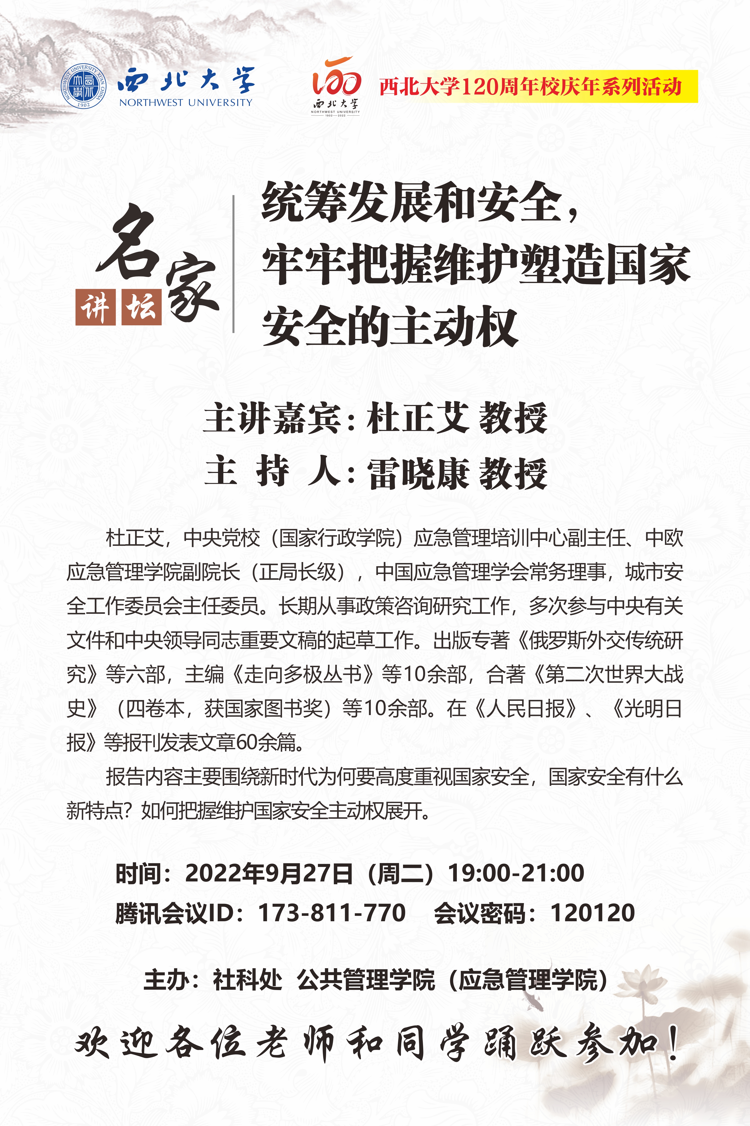 名家讲坛暨120周年校庆年系列活动:统筹发展和安全,牢牢把握维护塑造国家安全的主动权