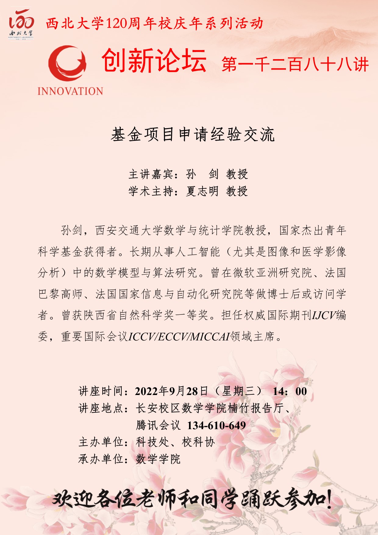孙 剑 教授 九游会在线登录官网创新论坛第一千二百八十八讲暨120周年校庆年系列活动:基金项目申请经验交流 讲座时间 2022年9月28日(星期三) 14:00 讲座地点 长安校区数学学院楠竹报告厅、腾讯会议 134-610-649 讲座人介绍 孙 剑 教授 讲座内容