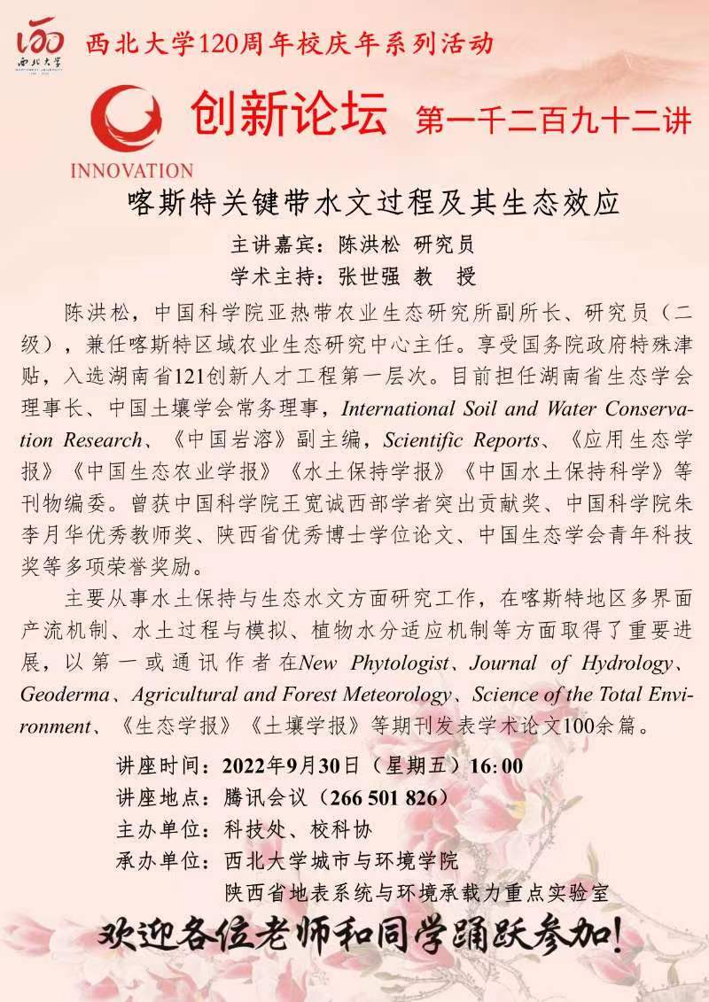 陈洪松 教授 九游会在线登录官网创新论坛第一千二百九十二讲暨120周年校庆年系列活动: 喀斯特关键带水文过程及其生态效应 讲座时间 2022年9月30日(星期五) 16:00 讲座地点 腾讯会议 266 501 826 讲座人介绍 陈洪松 教授 讲座内容