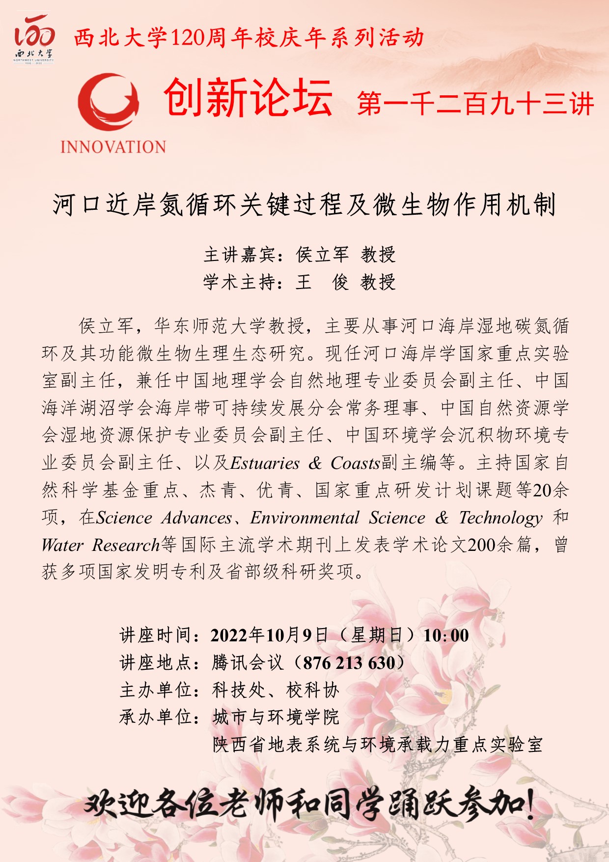 侯立军 教授 九游会在线登录官网创新论坛第一千二百九十三讲暨120周年校庆年系列活动: 河口近岸氮循环关键过程及微生物作用机制 讲座时间 2022年10月9日(星期日)10:00 讲座地点 腾讯会议(876 213 630) 讲座人介绍 侯立军 教授 讲座内容