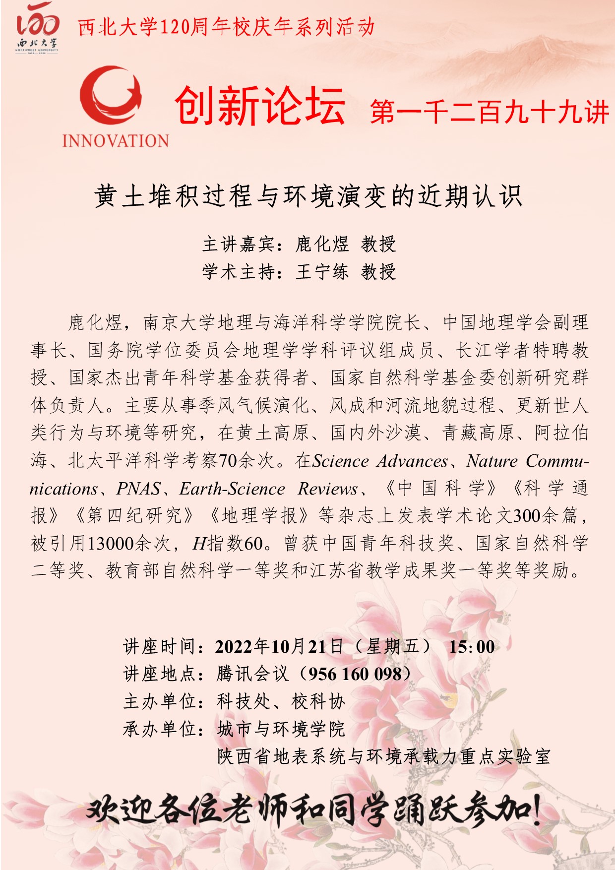 鹿化煜 教授 九游会在线登录官网创新论坛第一千二百九十九讲暨120周年校庆年系列活动:黄土堆积过程与环境演变的近期认识 讲座时间 2022年10月21日(星期五) 15:00 讲座地点 腾讯会议(956 160 098) 讲座人介绍 鹿化煜 教授 讲座内容