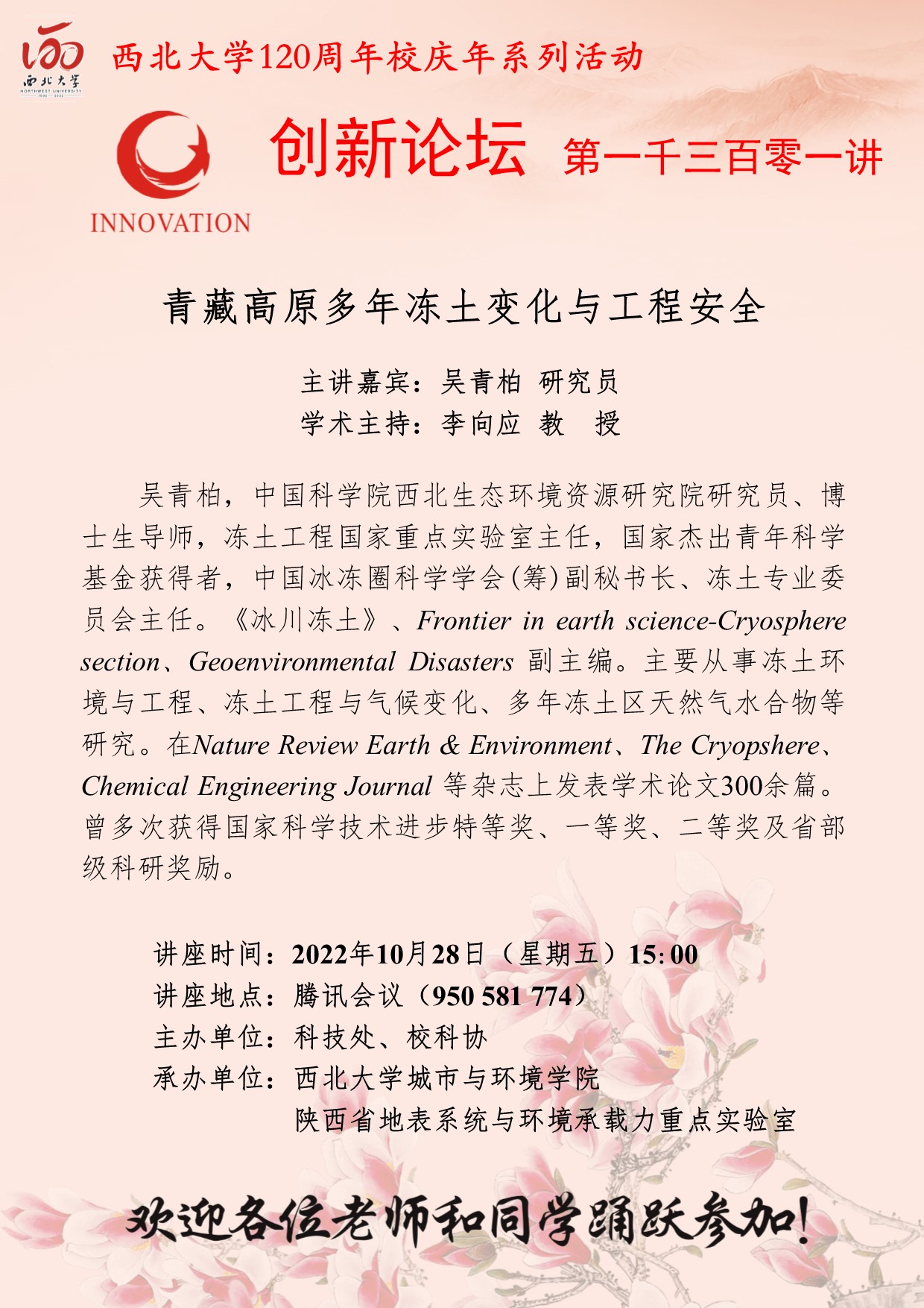 吴青柏 研究员 九游会在线登录官网创新论坛第一千三百零一讲暨120周年校庆年系列活动: 青藏高原多年冻土变化与工程安全 讲座时间 2022年10月28日(星期五)15:00 讲座地点 腾讯会议 950 581 774 讲座人介绍 吴青柏 研究员 讲座内容