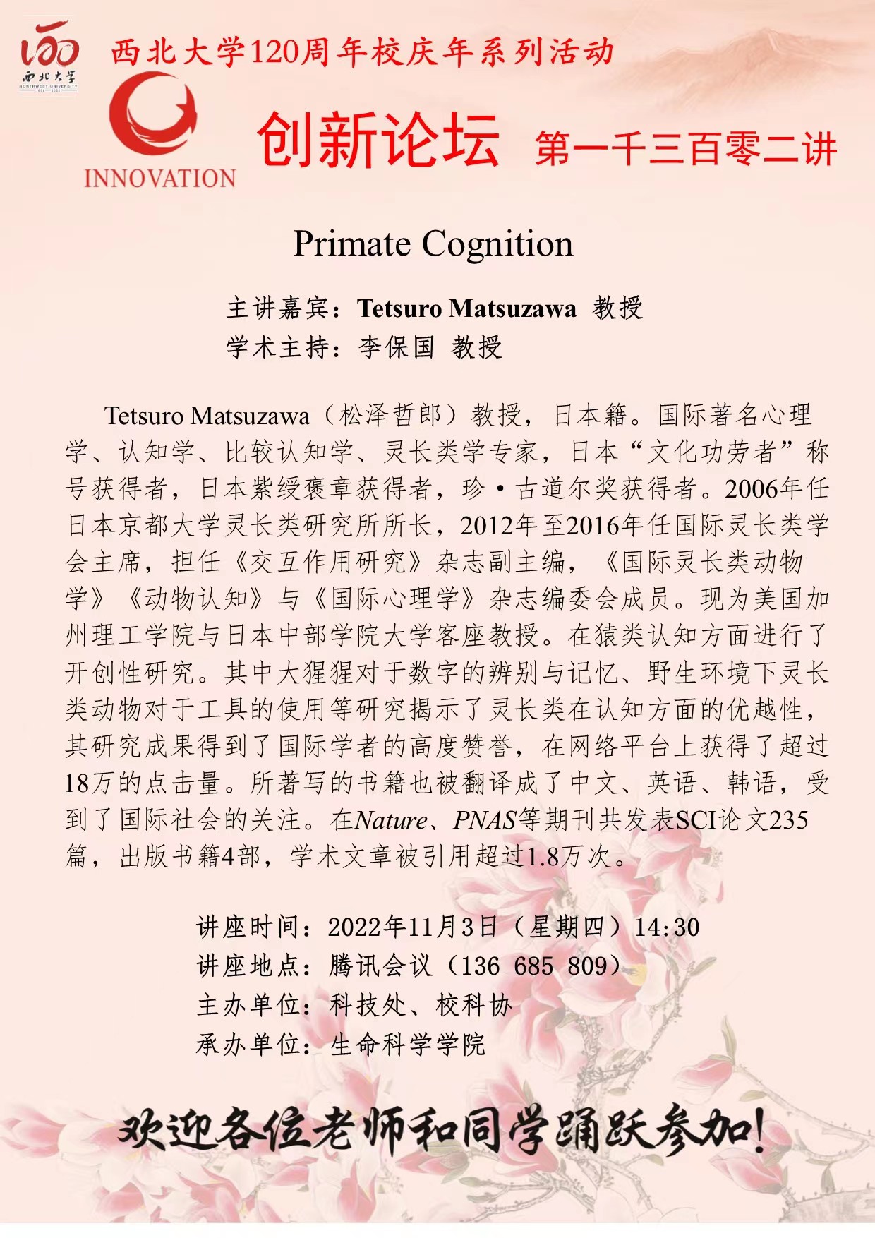 Tetsuro Matsuzawa 教授 九游会在线登录官网创新论坛第一千三百零二讲暨120周年校庆年系列活动: Primate Cognition 讲座时间 2022年11月3日(星期四)14:30 讲座地点 腾讯会议 136 685 809 讲座人介绍 Tetsuro Matsuzawa 教授 讲座内容