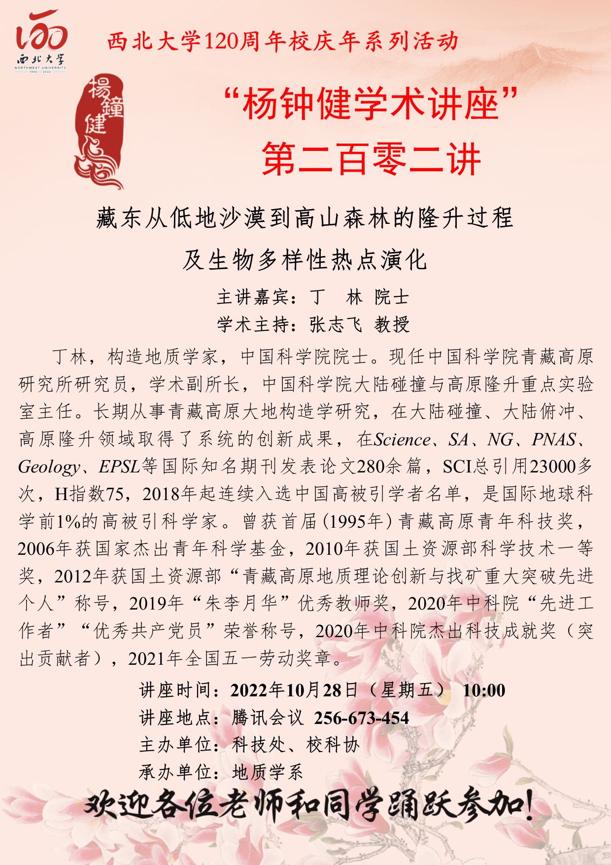 丁林 院士 “杨钟健学术讲座”第二百零二讲暨120周年校庆年系列活动: 藏东从低地沙漠到高山森林的隆升过程及生物多样性热点演化 讲座时间 2022年10月28日(星期五) 10:00 讲座地点 腾讯会议 256-673-454 讲座人介绍 丁林 院士 讲座内容