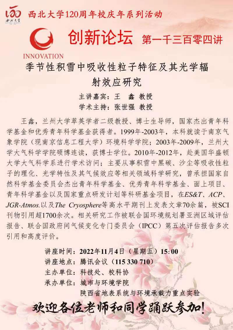 王 鑫 教授 九游会在线登录官网创新论坛第一千三百零四讲暨120周年校庆年系列活动: 季节性积雪中吸收性粒子特征及其光学辐射效应研究 讲座时间 2022年11月4日(星期五)15:00 讲座地点 腾讯会议 115 330 710 讲座人介绍 王 鑫 教授 讲座内容
