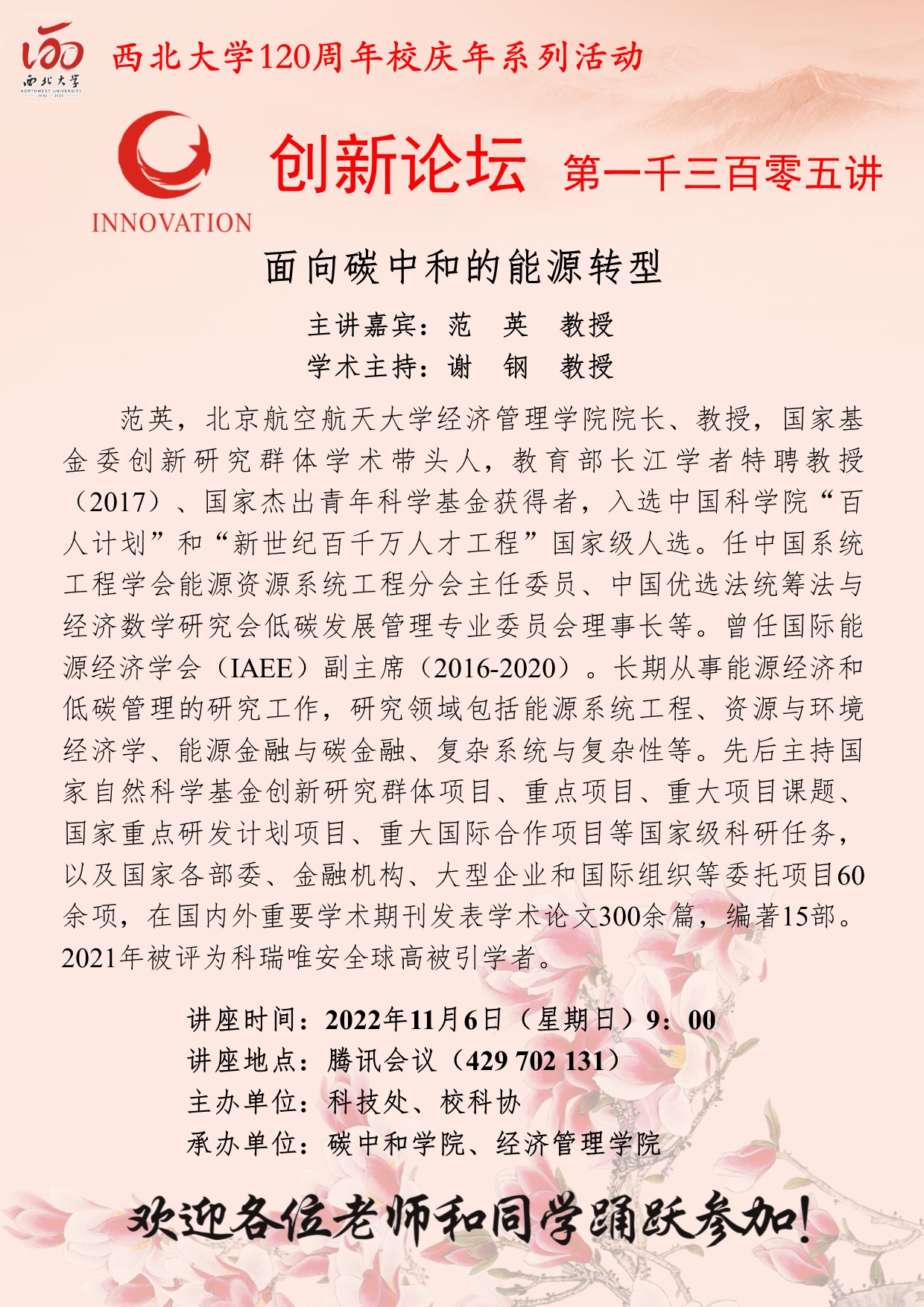 范英 教授 九游会在线登录官网创新论坛第一千三百零五讲暨120周年校庆年系列活动: 面向碳中和的能源转型 讲座时间 2022年11月6日(星期日)9:00 讲座地点 腾讯会议(429 702 131) 讲座人介绍 范英 教授 讲座内容