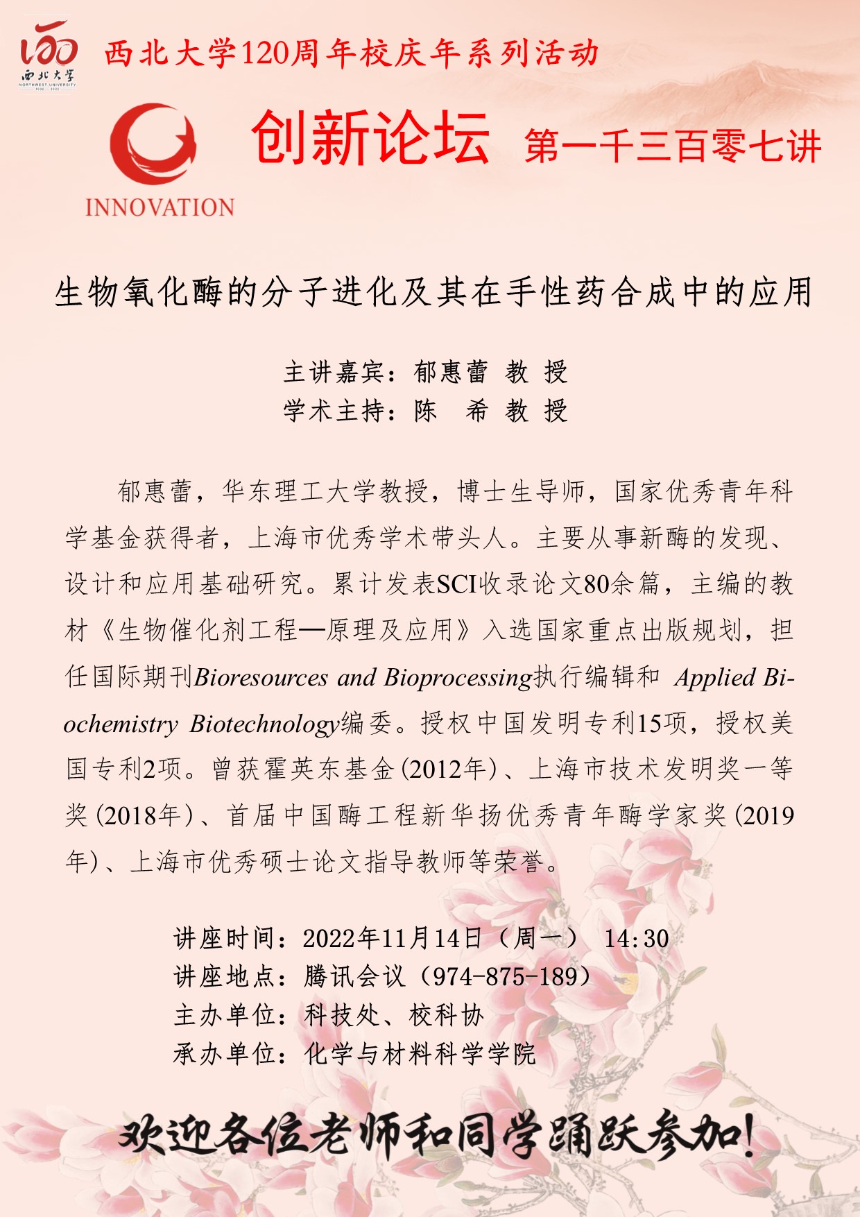郁惠蕾 教授 九游会在线登录官网创新论坛第一千三百零七讲暨120周年校庆年系列活动: 生物氧化酶的分子进化及其在手性药合成中的应用 讲座时间 2022年11月14日(星期一)14:30 讲座地点 腾讯会议(974 875 189) 讲座人介绍 郁惠蕾 教授 讲座内容