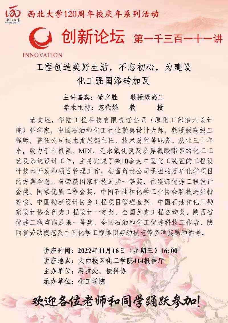 董文胜 教授级高工 九游会在线登录官网创新论坛第一千三百一十一讲暨120周年校庆年系列活动: 工程创造美好生活,不忘初心,为建设化工强国添砖加瓦 讲座时间 2022年11月16日(星期三)16:00 讲座地点 太白校区化工学院414报告厅 讲座人介绍 董文胜 教授级高工 讲座内容