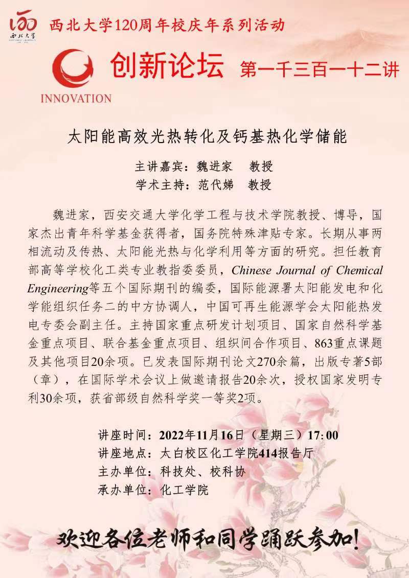 魏进家 教授 九游会在线登录官网创新论坛第一千三百一十二讲暨120周年校庆年系列活动:太阳能高效光热转化及钙基热化学储能 讲座时间 2022年11月16日(星期三)17:00 讲座地点 太白校区化工学院414报告厅 讲座人介绍 魏进家 教授 讲座内容