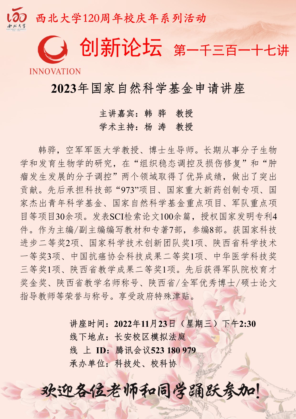 韩骅 教授 九游会在线登录官网创新论坛第一千三百一十七讲暨120周年校庆年系列活动:2023年国家自然科学基金申请讲座 讲座时间 2022年11月23日(星期三)下午2:30 讲座地点 长安校区模拟法庭 讲座人介绍 韩骅 教授 讲座内容