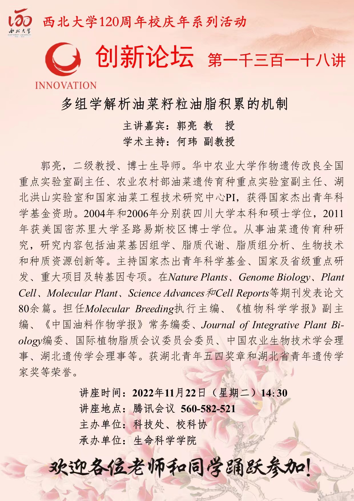 郭亮 教授 九游会在线登录官网创新论坛第一千三百一十八讲暨120周年校庆年系列活动: 多组学解析油菜籽粒油脂积累的机制 讲座时间 2022年11月22日(星期二) 14:30 讲座地点 腾讯会议 560-582-521 讲座人介绍 郭亮 教授 讲座内容