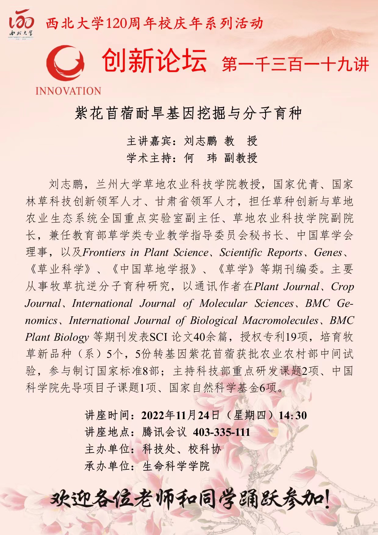 刘志鹏 教授 九游会在线登录官网创新论坛第一千三百一十九讲暨120周年校庆年系列活动: 紫花苜蓿耐旱基因挖掘与分子育种 讲座时间 2022年11月24日(星期四) 14:30 讲座地点 腾讯会议403-335-111 讲座人介绍 刘志鹏 教授 讲座内容