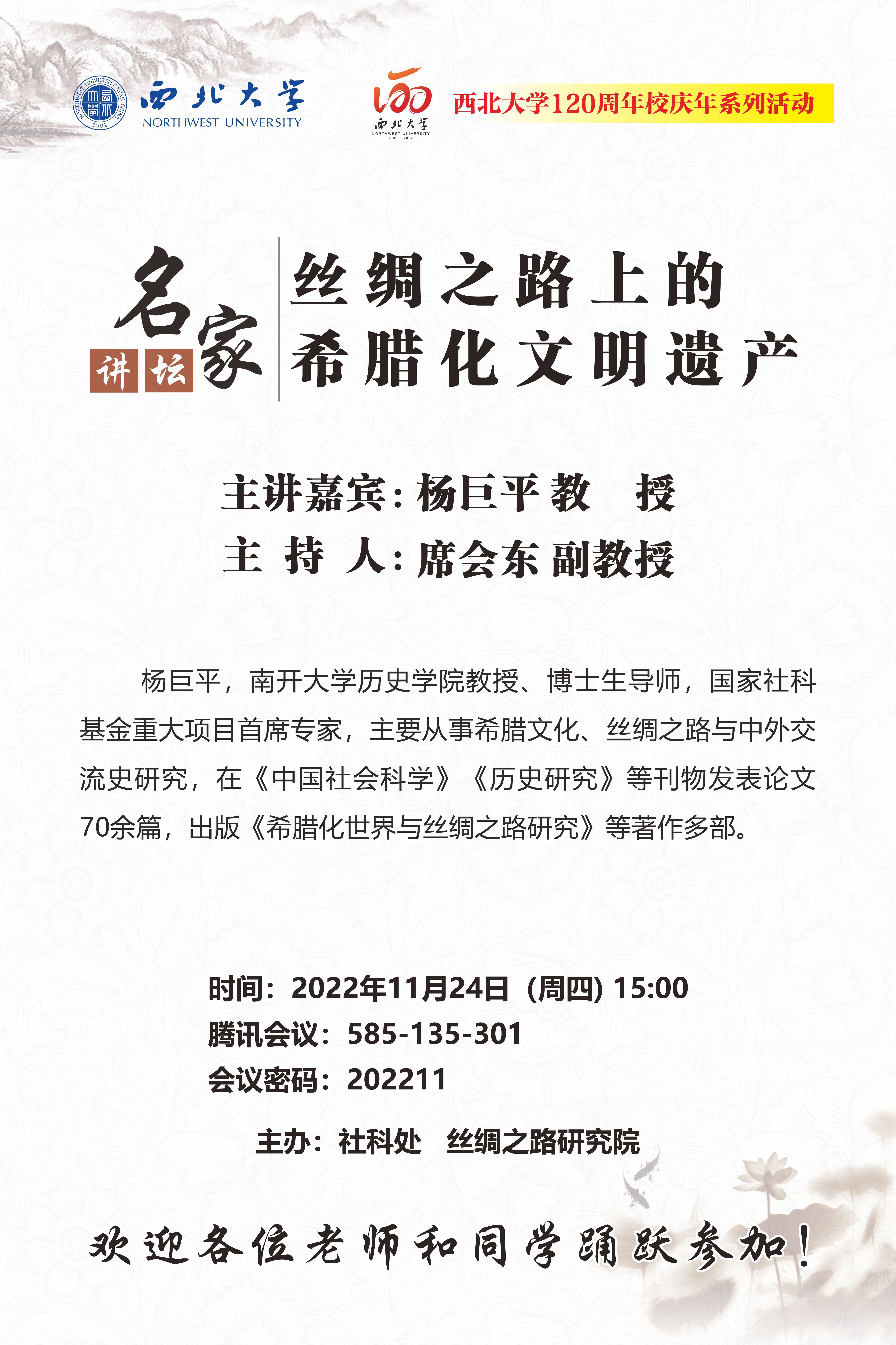 杨巨平 教授 名家讲坛暨120周年校庆年系列活动:丝绸之路上的希腊化文明遗产 讲座时间 2022年11月24日(周四)15:00 讲座地点 腾讯会议:585-135-301 讲座人介绍 杨巨平 教授 讲座内容