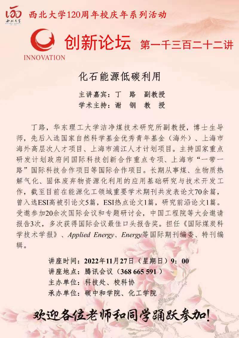 丁路 副教授 九游会在线登录官网创新论坛第一千三百二十二讲暨120周年校庆年系列活动: 化石能源低碳利用 讲座时间 2022年11月27日(星期日) 9:00 讲座地点 腾讯会议368 665 591 讲座人介绍 丁路 副教授 讲座内容