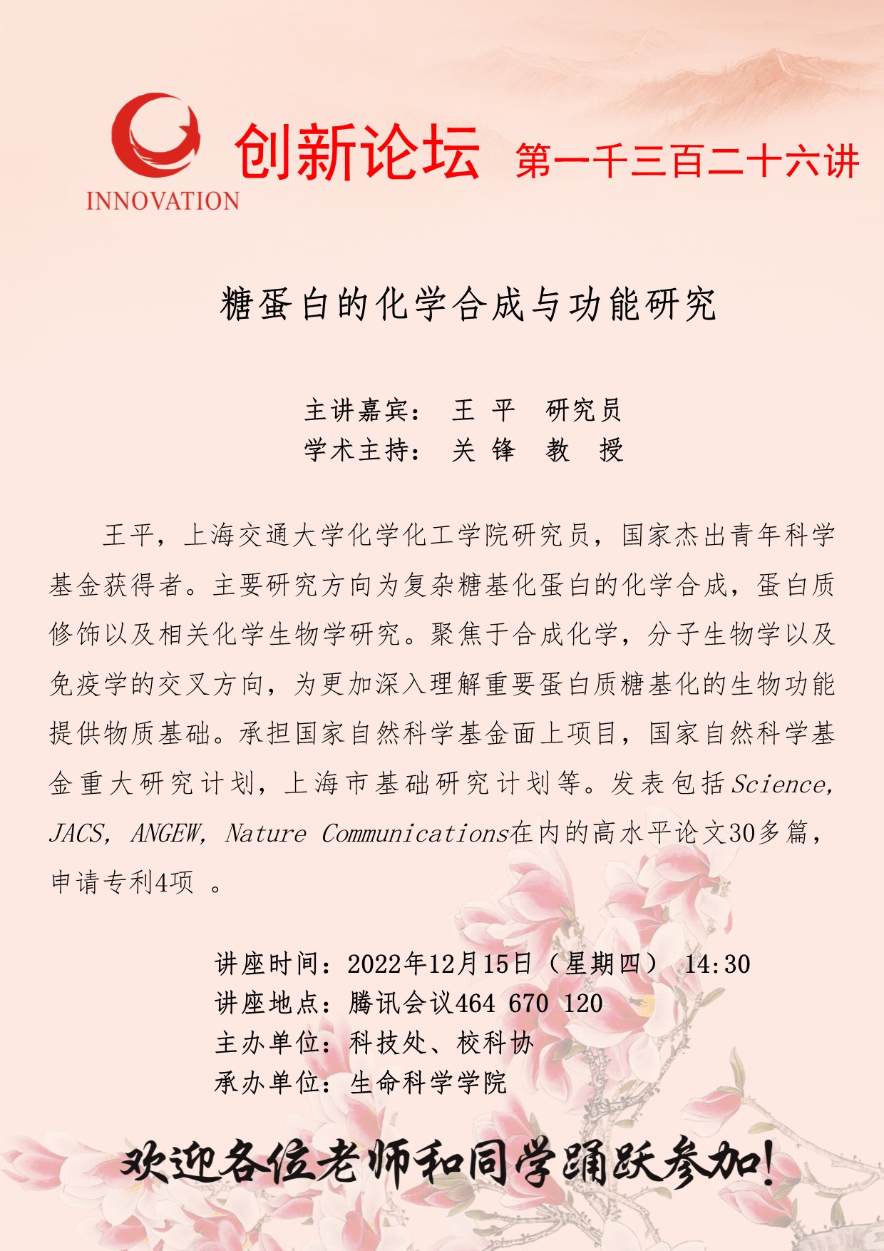 王平 研究员 九游会在线登录官网创新论坛第一千三百二十六讲:糖蛋白的化学合成与功能究 讲座时间 2022年12月15日(星期四) 14:30 讲座地点 腾讯会议464 670 120 讲座人介绍 王平 研究员 讲座内容