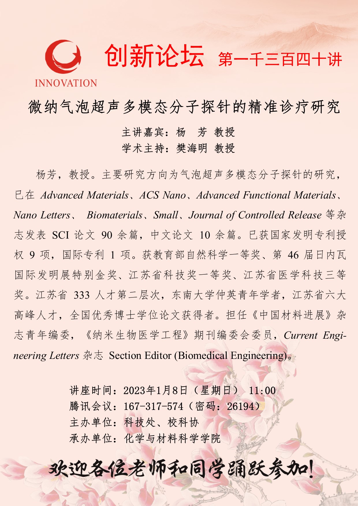 杨芳 教授 九游会在线登录官网创新论坛第一千三百四十讲:微纳气泡超声多模态分子探针的精准诊疗研究 讲座时间 2023年1月8日(星期日) 11:00 讲座地点 腾讯会议:167-317-574 讲座人介绍 杨芳 教授 讲座内容