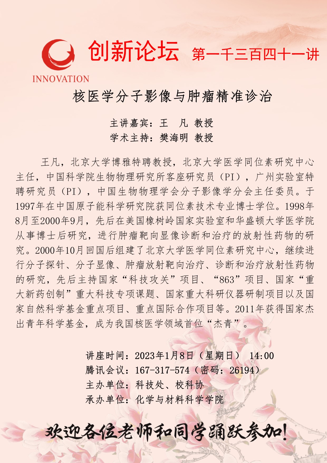王凡 教授 九游会在线登录官网创新论坛第一千三百四十一讲:核医学分子影像与肿瘤精准诊治 讲座时间 2023年1月8日(星期日) 14:00 讲座地点 腾讯会议:167-317-574 讲座人介绍 王凡 教授 讲座内容