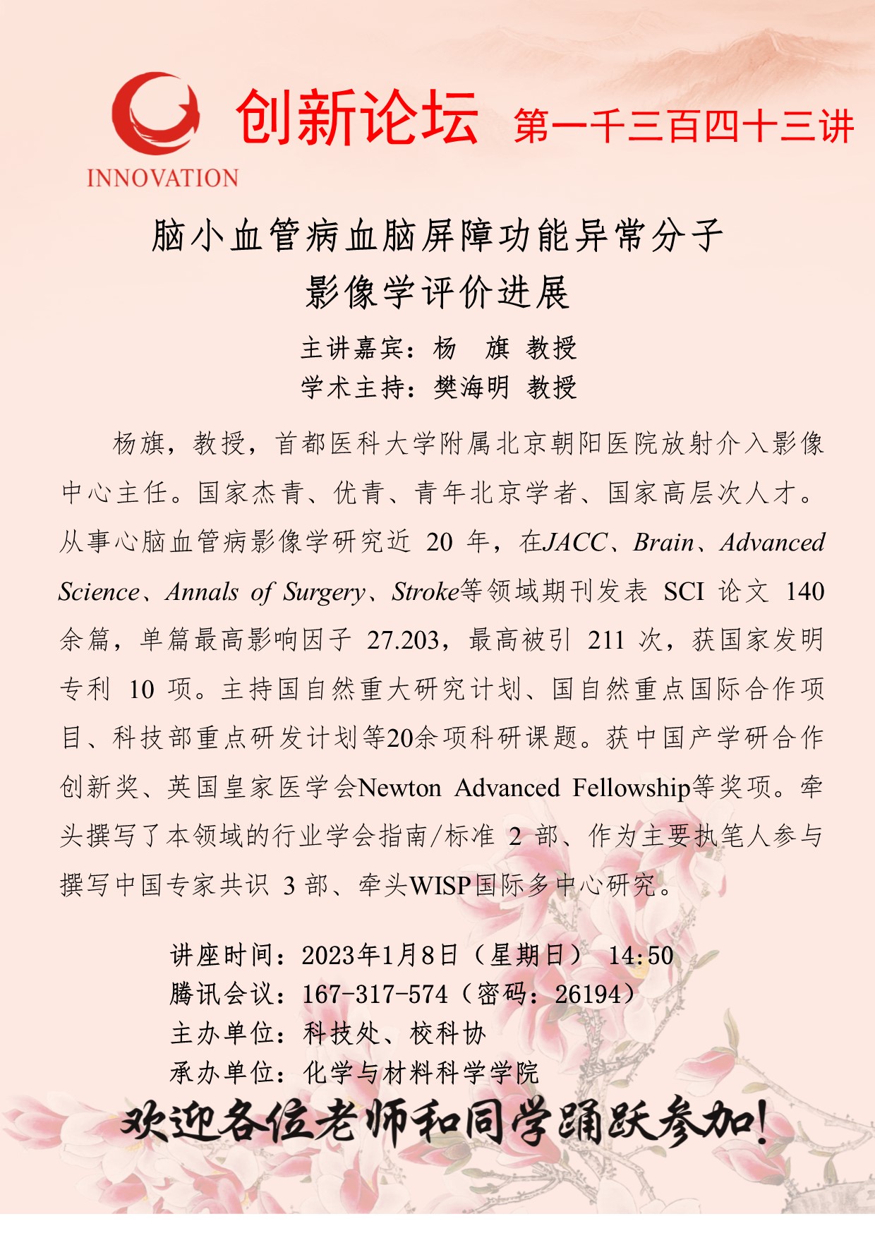 杨旗 教授 九游会在线登录官网创新论坛第一千三百四十三讲:脑小血管病血脑屏障功能异常分子影像学评价进展 讲座时间 2023年1月8日(星期日) 14:50 讲座地点 腾讯会议:167-317-574 讲座人介绍 杨旗 教授 讲座内容