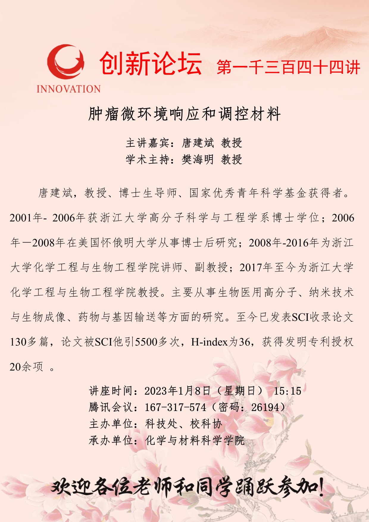 唐建斌 教授 九游会在线登录官网创新论坛第一千三百四十四讲:肿瘤微环境响应和调控材料 讲座时间 2023年1月8日(星期日) 15:15 讲座地点 腾讯会议:167-317-574 讲座人介绍 唐建斌 教授 讲座内容