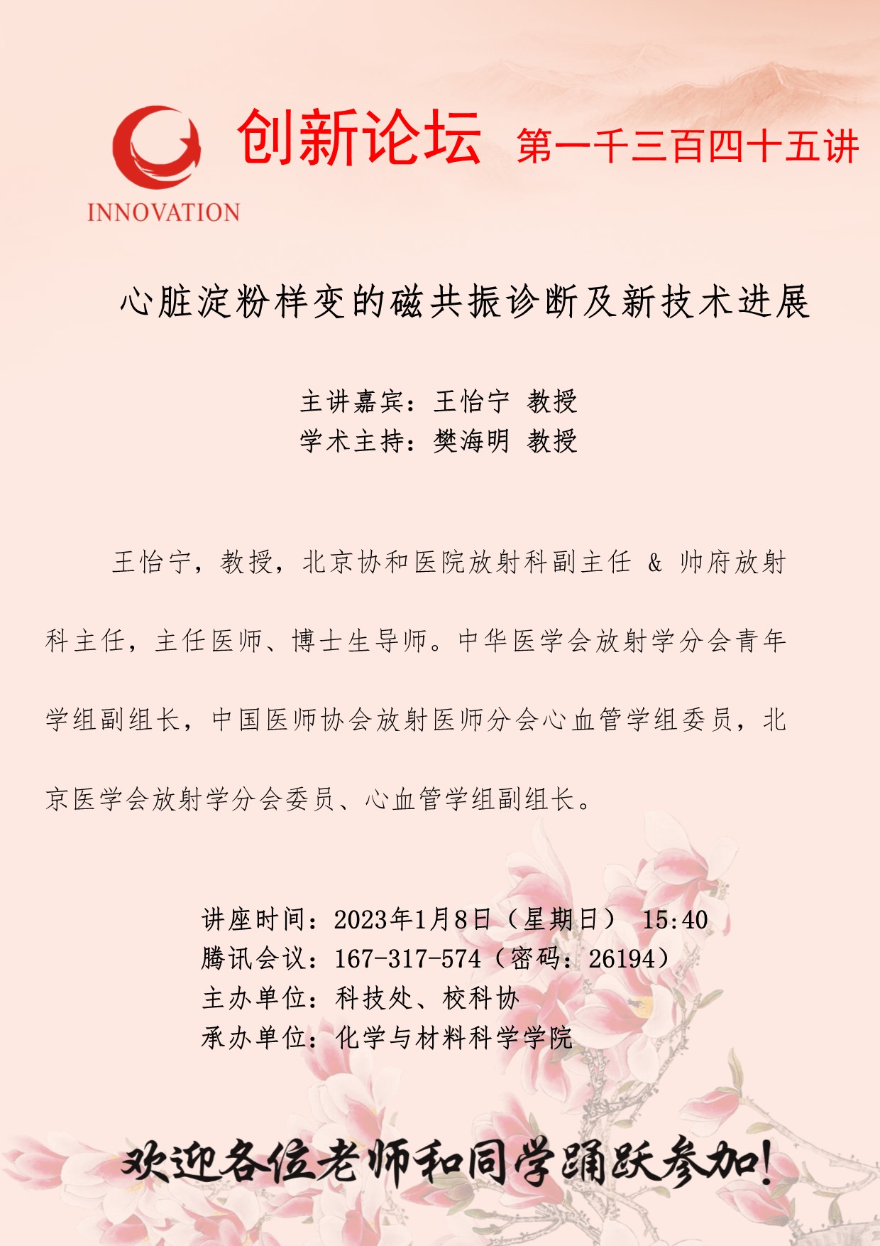 王怡宁 教授 九游会在线登录官网创新论坛第一千三百四十五讲:心脏淀粉样变的磁共振诊断及新技术进展 讲座时间 2023年1月8日(星期日) 15:40 讲座地点 腾讯会议:167-317-574 讲座人介绍 王怡宁 教授 讲座内容