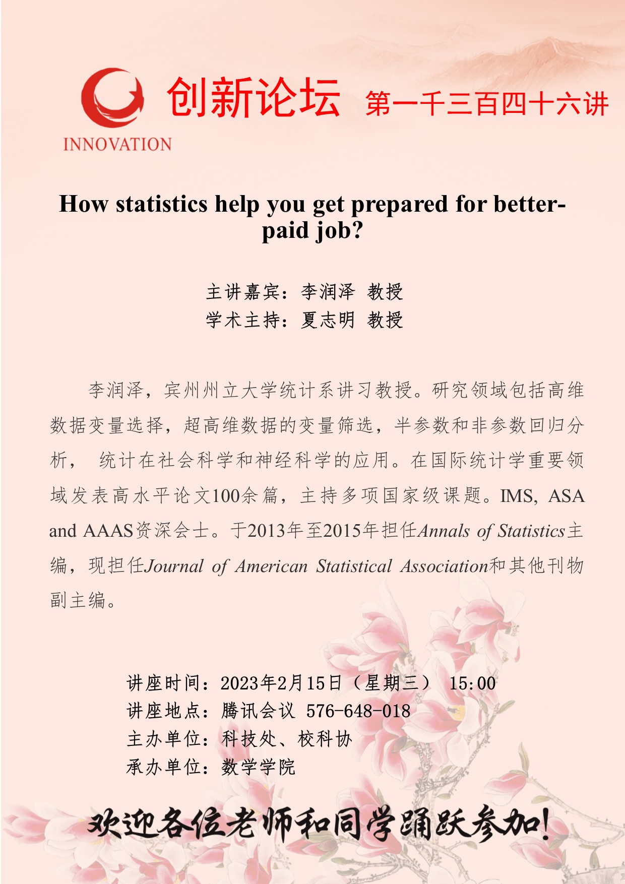 李润泽 教授 九游会在线登录官网创新论坛第一千三百四十六讲:How statistics help you get prepared for better-paid job? 讲座时间 2023年2月15日(星期三) 15:00 讲座地点 腾讯会议 576-648-018 讲座人介绍 李润泽 教授 讲座内容