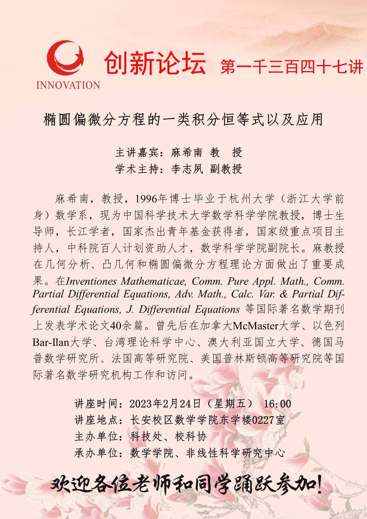 麻希南 教授 九游会在线登录官网创新论坛第一千三百四十七讲: 椭圆偏微分方程的一类积分恒等式以及应用 讲座时间 2023年2月24日(星期五)16:00 讲座地点 长安校区数学学院东学楼0227室 讲座人介绍 麻希南 教授 讲座内容