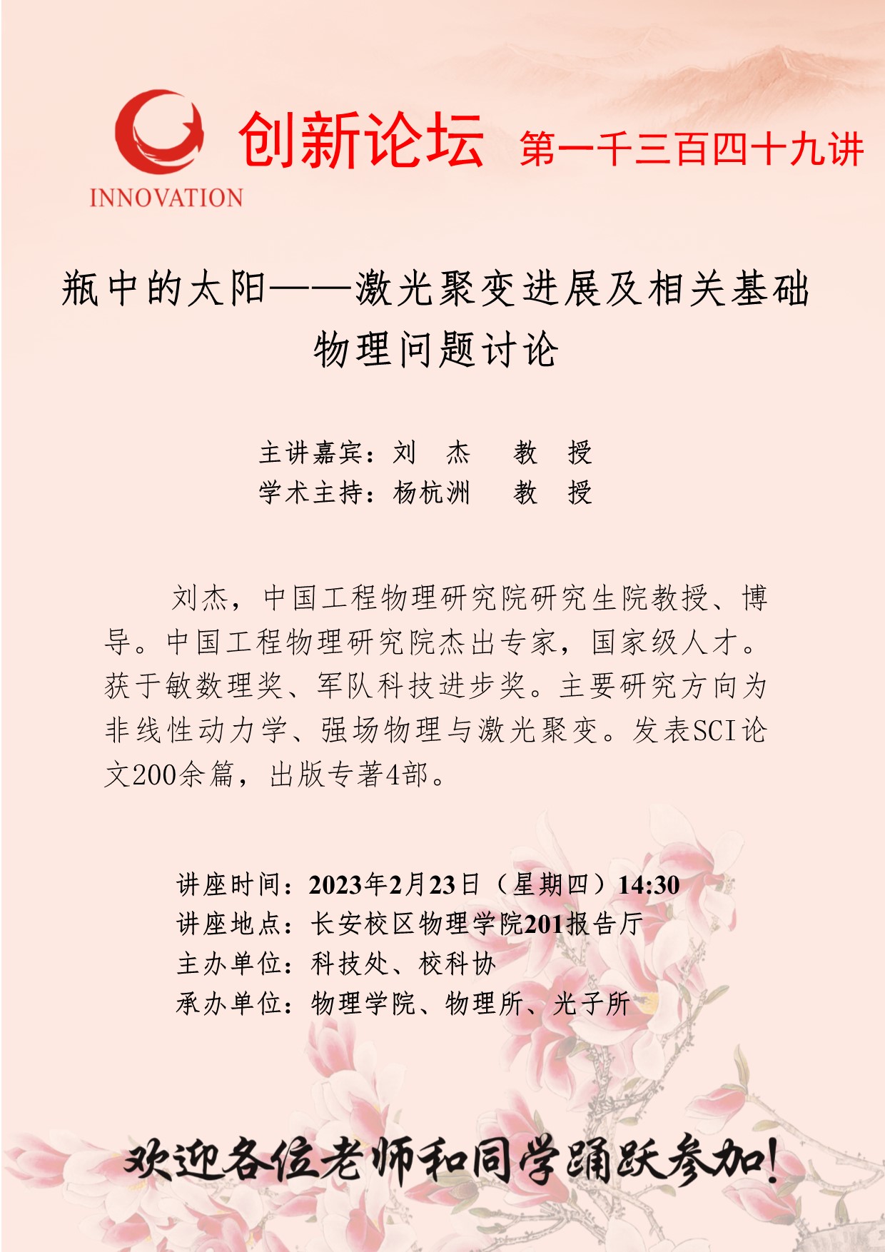 刘杰 教授 九游会在线登录官网创新论坛第一千三百四十九讲:瓶中的太阳——激光聚变进展及相关基础物理问题讨论 讲座时间 2023年2月23日(星期四)14:30 讲座地点 长安校区物理学院201报告厅 讲座人介绍 刘杰 教授 讲座内容