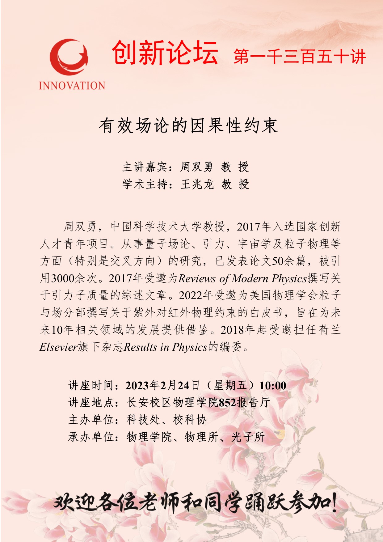 周双勇 教授 九游会在线登录官网创新论坛第一千三百五十讲: 有效场论的因果性约束 讲座时间 2023年2月24日(星期五)10:00 讲座地点 长安校区物理学院852报告厅 讲座人介绍 周双勇 教授 讲座内容