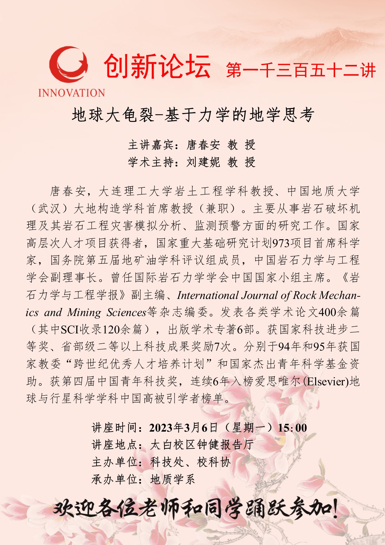 唐春安 教授 九游会在线登录官网创新论坛第一千三百五十二讲:地球大龟裂-基于力学的地学思考 讲座时间 2023年3月6日(星期一)15:00 讲座地点 太白校区钟健报告厅 讲座人介绍 唐春安 教授 讲座内容