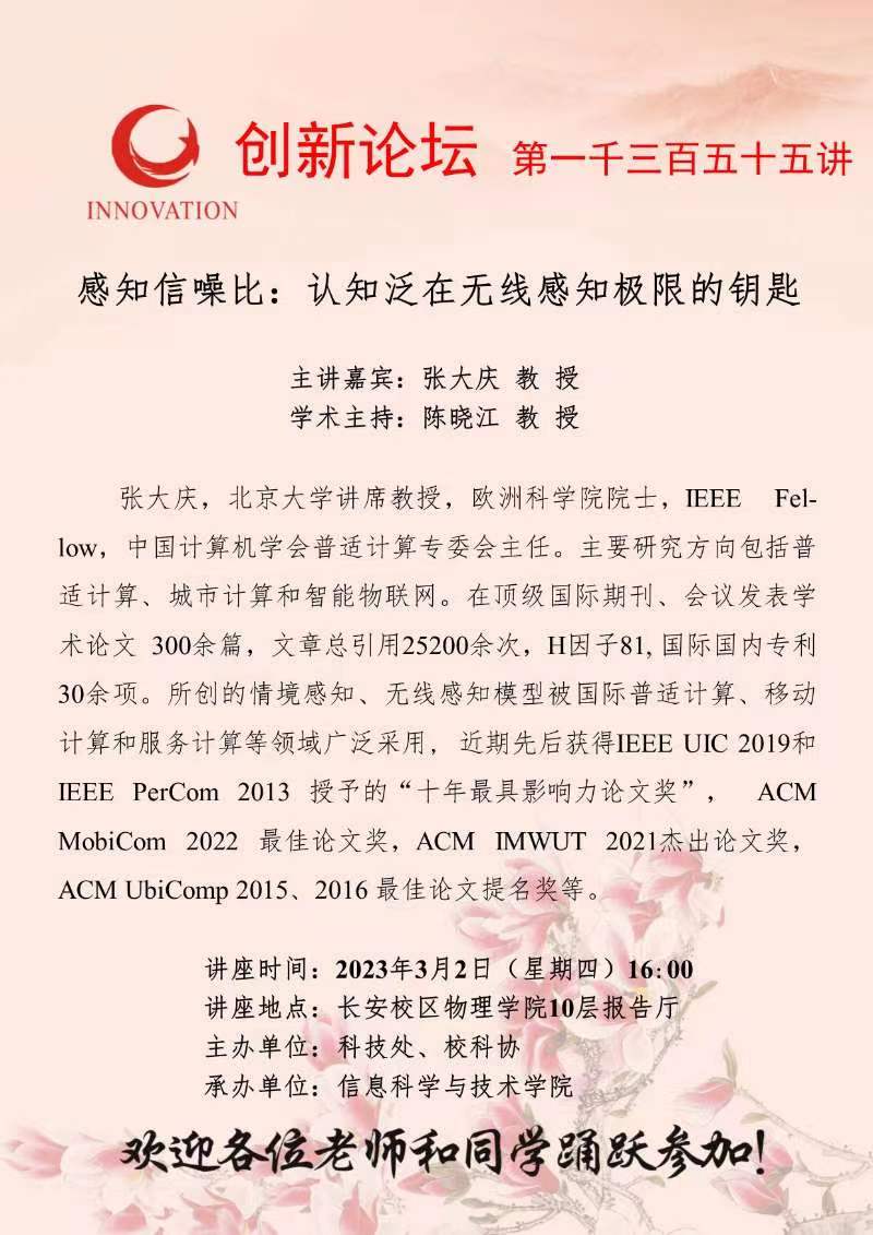 张大庆 教授 九游会在线登录官网创新论坛第一千三百五十五讲:感知信噪比:认知泛在无线感知极限的钥匙 讲座时间 2023年3月2日(星期四)16:00 讲座地点 长安校区物理学院10层报告厅 讲座人介绍 张大庆 教授 讲座内容