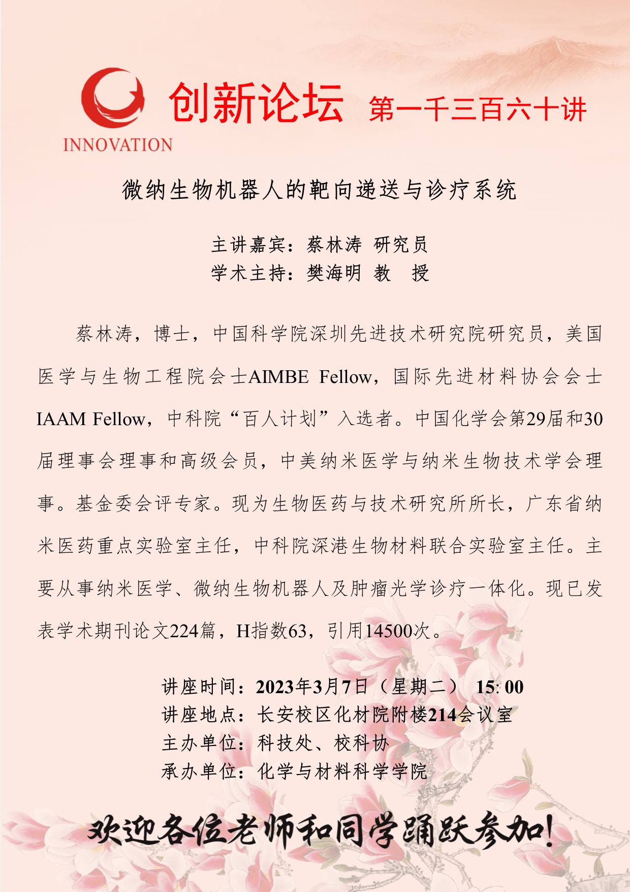 蔡林涛 研究员 九游会在线登录官网创新论坛第一千三百六十讲:微纳生物机器人的靶向递送与诊疗系统 讲座时间 2023年3月7日(星期二) 15: 00 讲座地点 长安校区化材院附楼214会议室 讲座人介绍 蔡林涛 研究员 讲座内容