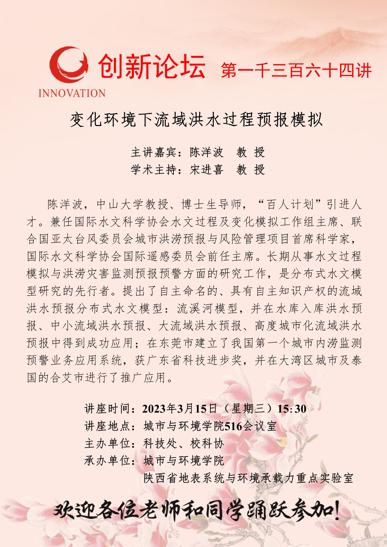 陈洋波 教授 九游会在线登录官网创新论坛第一千三百六十四讲:变化环境下流域洪水过程预报模拟 讲座时间 2023年3月15日(星期三)15:30 讲座地点 城市与环境学院516会议室 讲座人介绍 陈洋波 教授 讲座内容