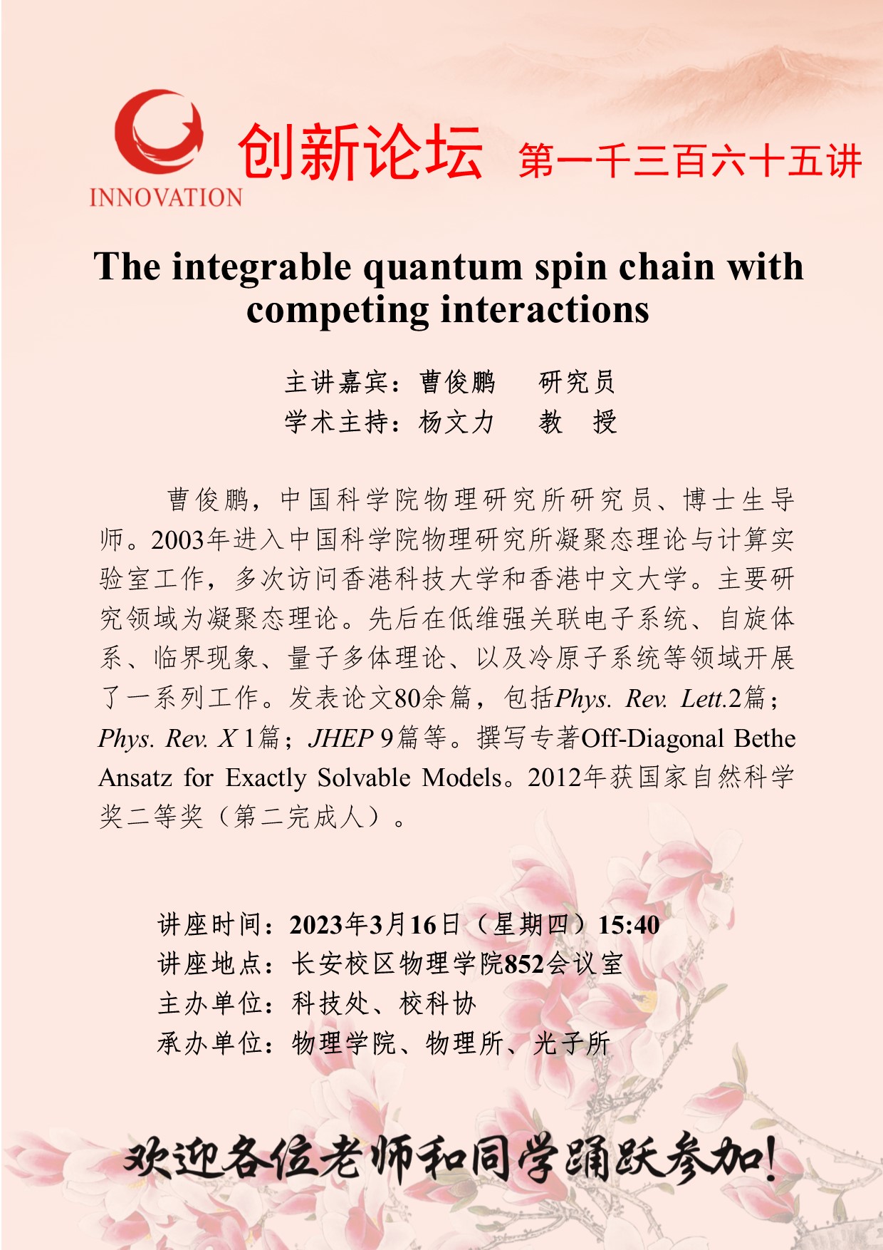 曹俊鹏 研究员 九游会在线登录官网创新论坛第一千三百六十五讲:The integrable quantum spin chain with competing interactions 讲座时间 2023年3月16日(星期四)15:40 讲座地点 长安校区物理学院852会议室 讲座人介绍 曹俊鹏 研究员 讲座内容