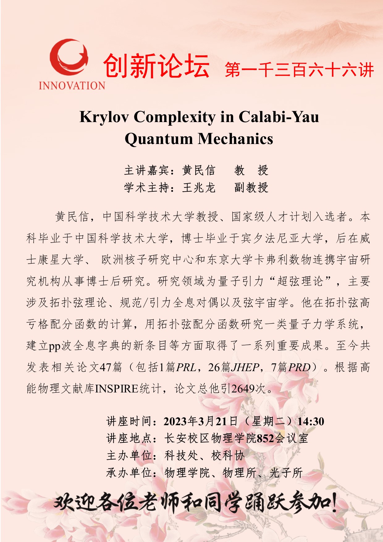 黄民信 教授 九游会在线登录官网创新论坛第一千三百六十六讲:Krylov Complexity in Calabi-Yau Quantum Mechanics 讲座时间 2023年3月21日(星期二)14:30 讲座地点 长安校区物理学院852会议室 讲座人介绍 黄民信 教授 讲座内容