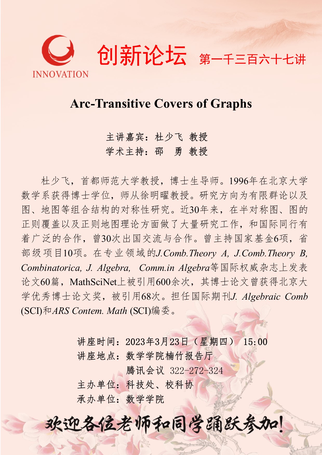 杜少飞 教授 九游会在线登录官网创新论坛第一千三百六十七讲:Arc-Transitive Covers of Graphs 讲座时间 2023年3月23日(星期四) 15:00 讲座地点 数学学院楠竹报告厅、腾讯会议 322-272-324 讲座人介绍 杜少飞 教授 讲座内容